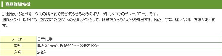 日新化学工業 1層ポリダクト 0.1mm厚 600mm×100m 2本入 農業資材 園芸用品 家庭菜園 ビニールハウス 加温機 送風ダクト 精米機 もみがら チューブロール