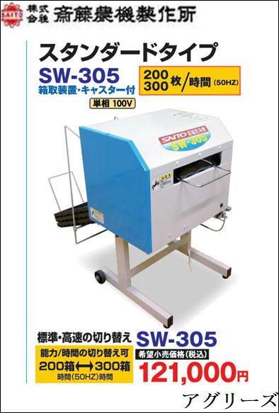 サイトーの苗箱洗浄機 SW-305は、農業現場での苗箱洗浄作業を効率的にサポートする機械です。高圧水流とブラシを活用した洗浄システムにより、汚れや泥を素早く、徹底的に除去します。作業時間の短縮と労力の軽減を実現し、忙しい農業の現場で重宝します。操作が簡単で、安定した洗浄性能を提供します。