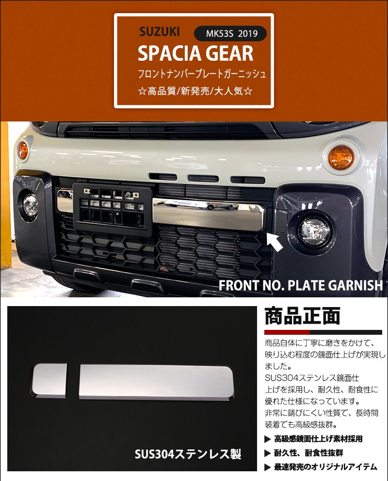 スズキ スペーシアギア MK53S 2019年〜 平成31年〜 フロントナンバープレートカバー フロントナンバープレートトリム ナンバープレートモール ナンバープレートガーニッシュ ステンレス製 鏡面仕上げ 外装パーツ カスタムパーツ カーパーツ スズキ車用品 ドレスアップ フロントナンバープレート周り プロテクター