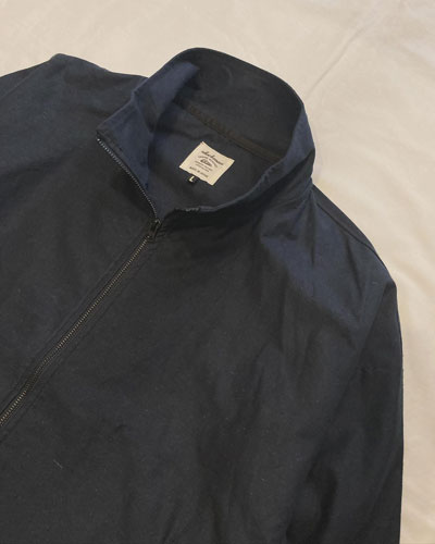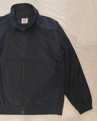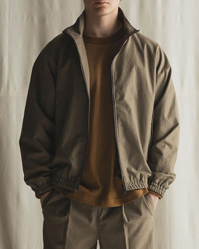 綿ツイル一枚仕立てのジップアップブルゾンは、ショート丈裾ギャザーのいわゆるスウィングトップのスタイルのジャケット。 野球投手の調子を見守るコーチがブルペンで着用する襟付きジャケットをモチーフに、トラックジャケットをコットンツイルの布帛で仕立てたドリズラーブルゾンです。