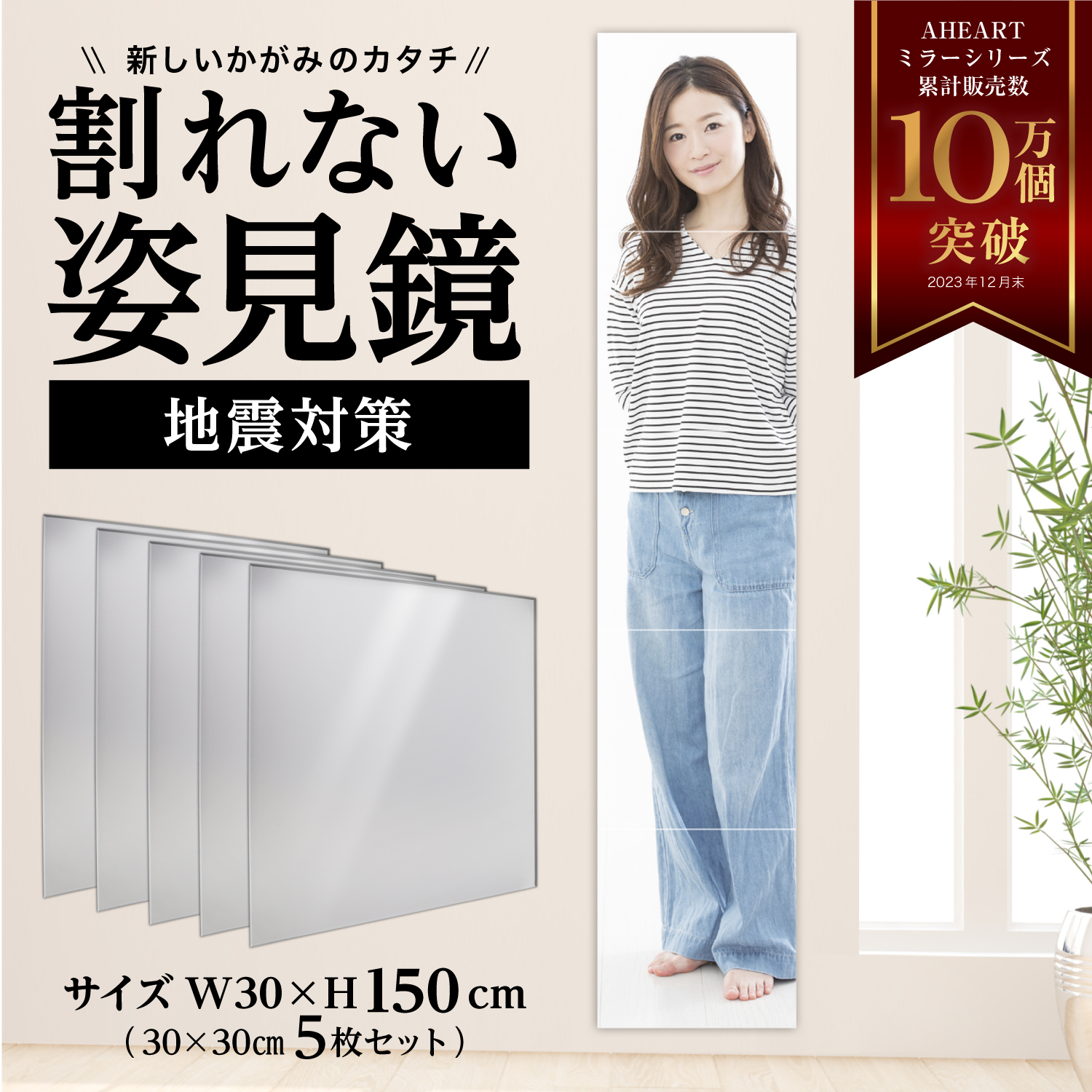 【製品仕様】30cm×30cm5枚入、最大高さ150cmの姿見になる。