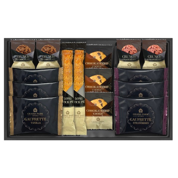 ●ロングスティックパイ×2、ゴーフレット(バニラ・ストロベリー)×各3、チョコクランチ(ミルク・ストロベリー)×各2、チョコチップクッキー×3●箱24.5×40×3.5cm(日本製)●賞味期限/180日(製造日より)