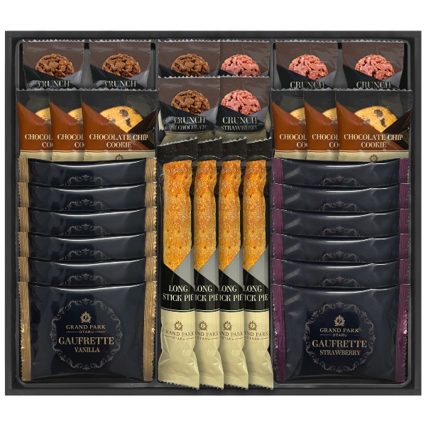 ●ロングスティックパイ×4、ゴーフレット(バニラ・ストロベリー)×各6、チョコクランチ(ミルク・ストロベリー)×各4、チョコチップクッキー×6●箱33.5×37.6×4.5cm(日本製)●賞味期限/180日(製造日より)