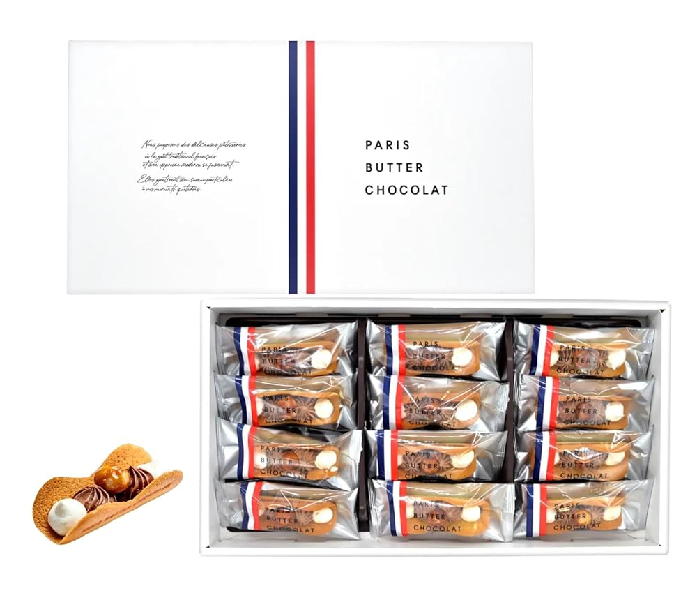 | 主な仕様 | ?PARIS BUTTER CHOCOLAT(パリバターショコラ)12個入り? バター × ショコラの組み合わせ ― バター薫るラングドシャ生地に生食感ショコラを包んだ一品。?香ばしいマカダミアナッツ入り ― 食感と味わいを引き立てます※繊細な商品となり、割れやカケのリスクが伴う商品となりますのでご理解の上ご購入お願い申し上げます。 |