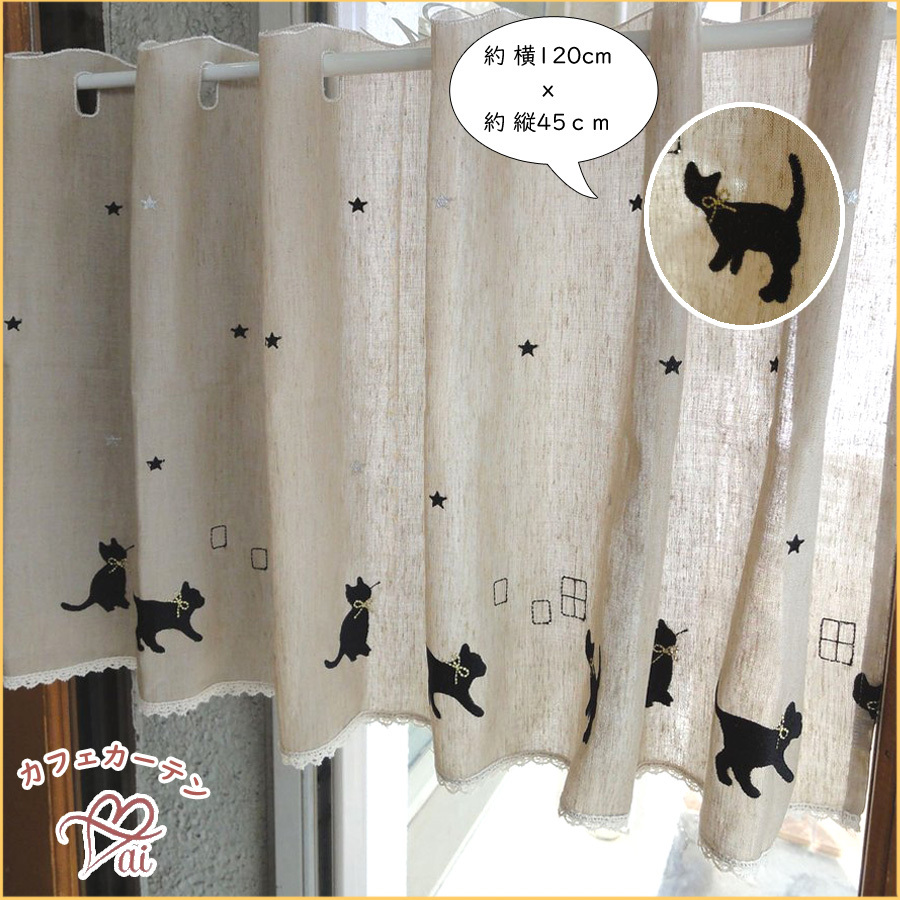 aiカフェカーテン ポスト投函で送料無料 星と猫 縦45cm ショート カフェカーテン 麻混 ノロノロ 黒猫 ネコミィーちゃん ショート 麻混 ノロノロ ネコ クロネコ