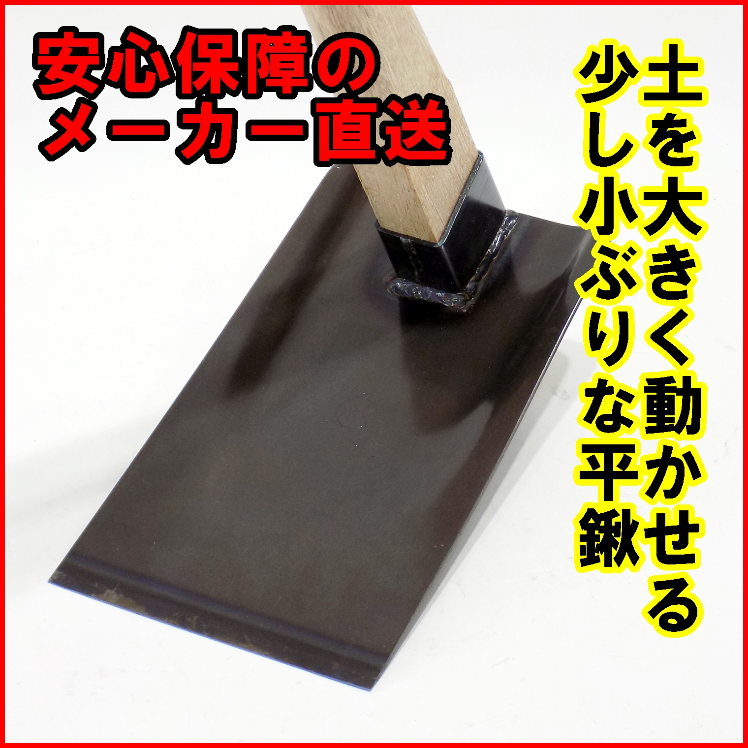 一度に大きく土を動かせるように、U字の型押しに土をたくさん盛ることが出来る、少し小ぶりな家庭菜園用の平鍬です。