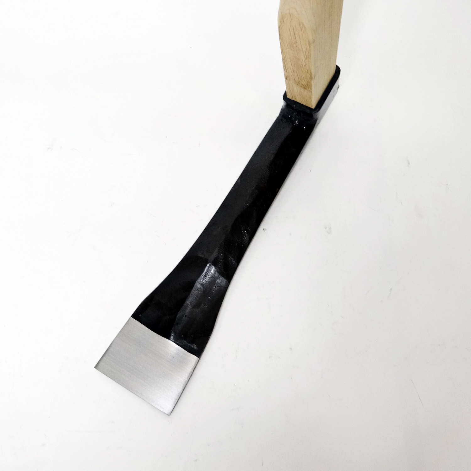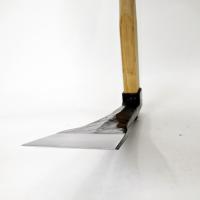 地下茎を切り分けタケノコを根本から切り離す十分な刃幅のタケノコ掘り専用鍬です。扱いやすく軽量化するために、刃元を細くしながらも中央部の厚みを増す「しのぎ」を造作し強度を確保しています。タケノコ掘り専用鍬ですが、家庭菜園では、耕作の初めの土が固く締まった畑の土起こしにも使えます。