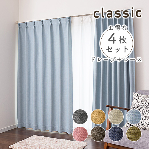 オーダーカーテン 落ち着いたモダンな遮光2級カーテン「クラシック」レース付き4枚セット