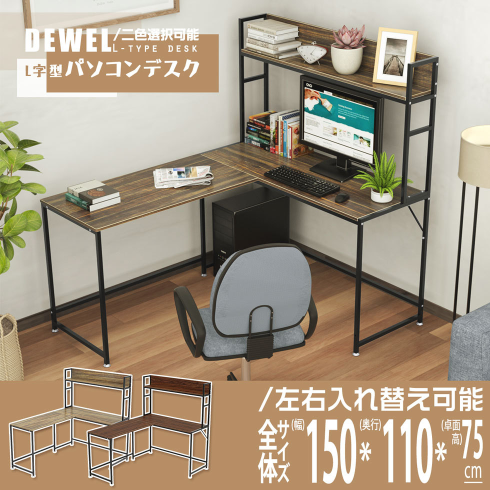 コーナーデスク 収納棚付 幅150cm L字型 2色選択 数量限定キャンペーン DEWEL パソコンデスク 収納棚 ラック付き アジャスタ付き オフィスデスク 木目柄 勉強机