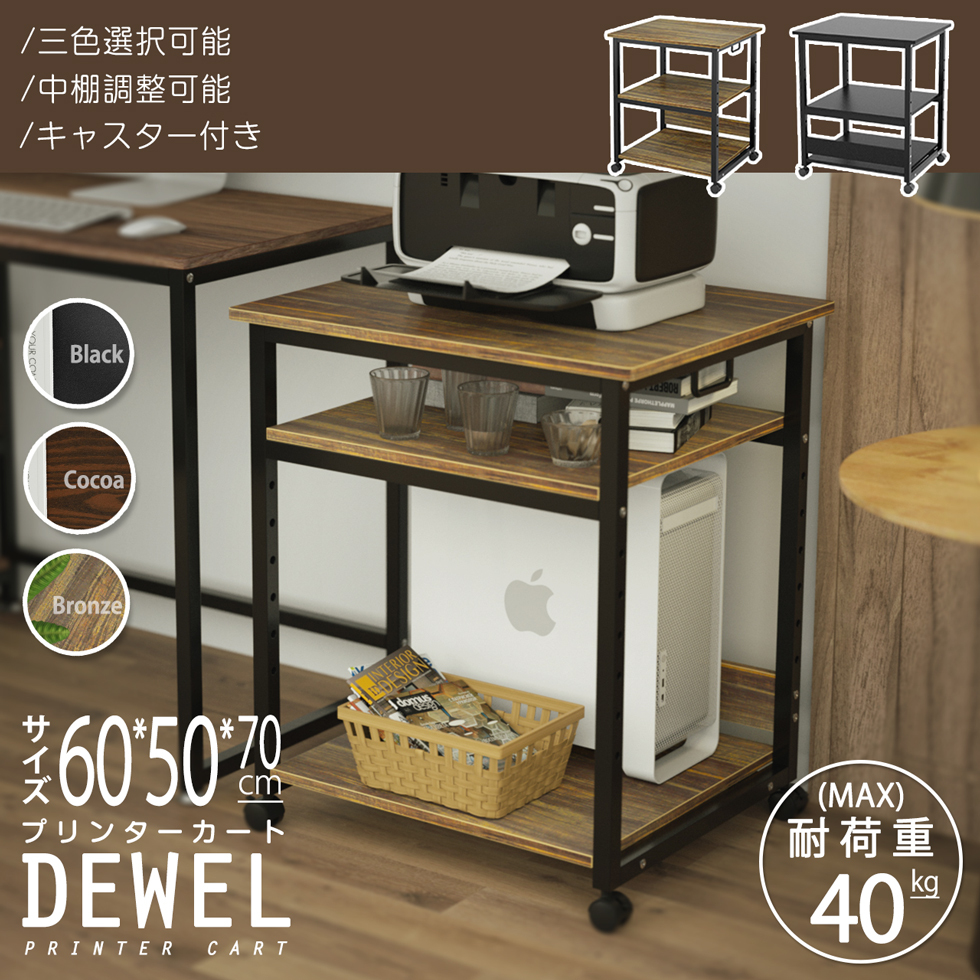 プリンタ台 プリンタラック 3段 総耐荷重90kg DEWEL 高さ70 幅60 キャスター付き プリンターカート プリンターワゴン