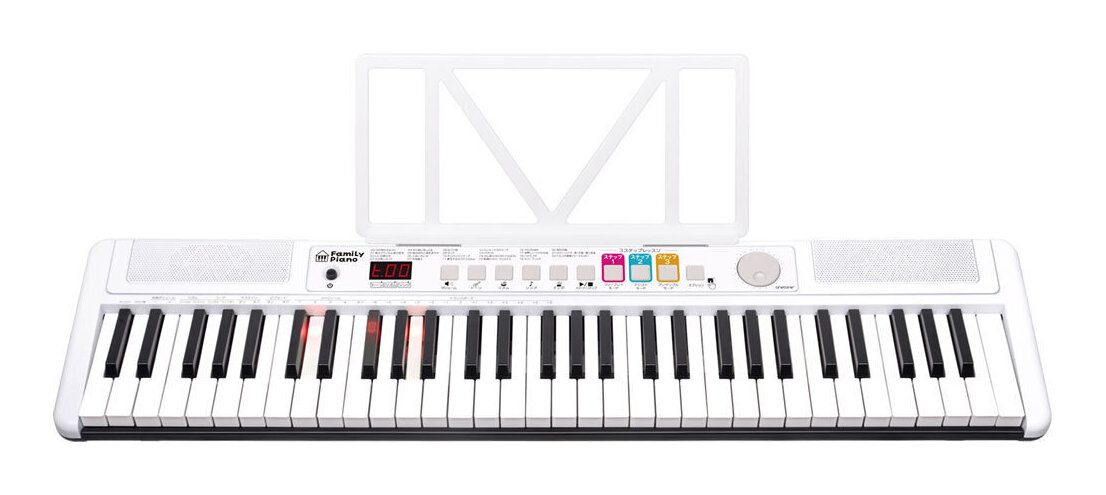 こちらの商品はお取り寄せとなります。3日〜1週間ほどでお届け可能です。メーカー品切の際はお時間を頂きます。※画像は撮影用商品のため、お届けの際の商品とは異なります。家族全員で楽しめる、はじめての方にもやさしい、使い易くて多機能な61伴盤キーボードが登場しました。光るLED内蔵伴盤が演奏を優しくサポート。難しい専門用語がなく、わかりやすい日本語表記パネルと、シンプルなボタン配置により、全年齢層が迷わず操作できます。さらにレベルに合わせた3ステップレッスン機能や内蔵曲の楽譜集付きで、自然に演奏力を育ててくれます。譜面台・ヘッドフォン・マイクなどがそろった充実のセット内容で、届いたその日からすぐに演奏を楽しめます。●LED内蔵で光る伴盤●シニア、お子様にもやさしいシンプルでわかりやすい日本語パネル●全世代が使いやすいかんたん操作●誰もが知っている往年のヒットソングを収録●内蔵曲の楽譜集付属●光るLED伴盤でアシストする3ステップレッスン機能●ヘッドフォンやかんたん操作ガイドなど充実のセット内容●約2kgの軽量ボディで持ち運びもカンタン使いやすさにこだわった日本語表示&簡単操作光るLED内蔵伴盤:押した伴盤が光る
