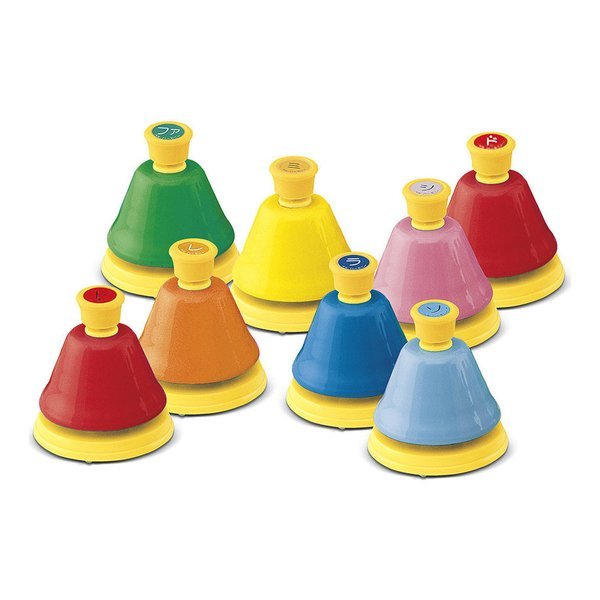 こちらの商品はお取り寄せとなります。3日〜1週間ほどでお届け可能です。メーカー品切の際はお時間を頂きます。こちらの商品は一部の地域*を除き送料無料(送料込)です。*離島地域・北海道・沖縄へのお届けは別途、送料が必要になりますので、ご注文の前にご連絡下さい。送料をお知らせいたします。基本セットベルハーモニー デスクタイプ(幹音)MBD-8ベルハーモニー・デスクタイプ全音域2オクターブの中心になる、1オクターブ幹音のみの8音セットです。概要机などの上に置き、キャップを叩いて演奏するベルです。置き方を工夫することで様々な演奏が可能で、動きやあそびの要素を取り入れやすいでしょう。また、ベルを持ち替える必要が無いので、一人でより多くの音を演奏できます、複数の楽器を担当しても良いでしょう。特長ベルハーモニーとは?色で音が分かるベルがセットにベルハーモニーは音別に色分けされたベルがセットになっています。ベルの色と音の関係は図の通りです。 幹音は単色、派生音は2トーン幹音はベルの色が単色で柄やキャップの色が黄色。派生音はベルの色が2トーンで柄やキャップの色が黒です。 ハンドタイプとデスクタイプの2種類