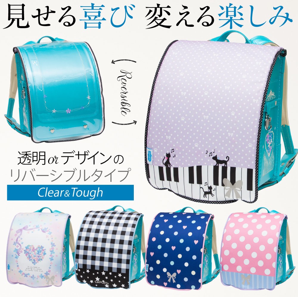 デザイン面と透明・クリア面が1つになったリバーシブルタイプのランドセルカバー「ランドセルカバー らんらんCAP リバーシブル and クリア」です。