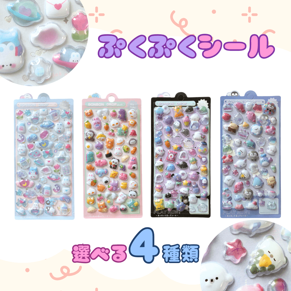 ぷくぷくシール 4種類 立体 シール クリア ぷっくり キャラクター 動物 おばけ ハート 食べ物 手帳シール トレカケース Ailes エール
