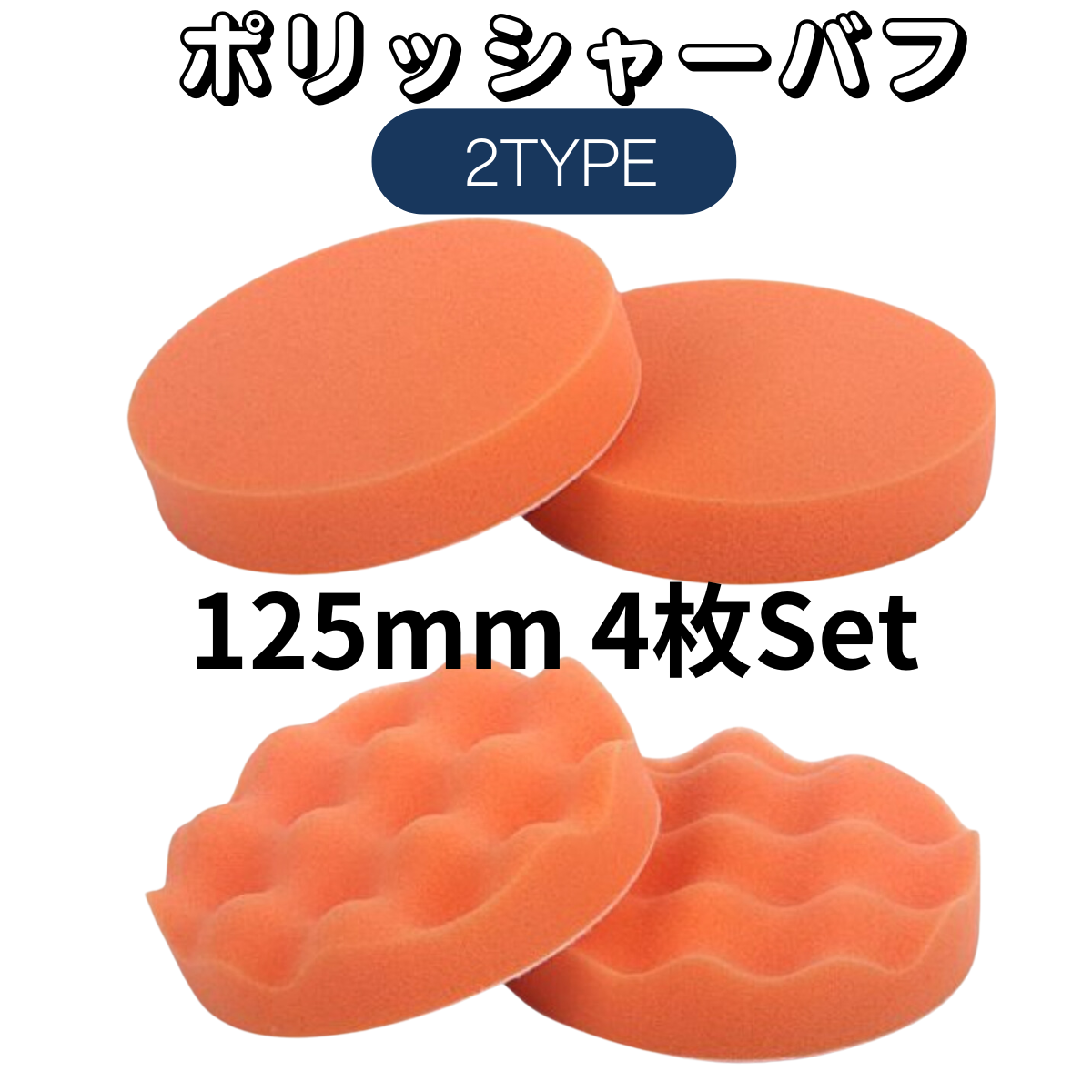 ポリッシャーバフ スポンジバフ 125mm 4枚セット 扁平スポンジ オレンジ 電動ポリッシャー 磨きワックス用 平型 波型
