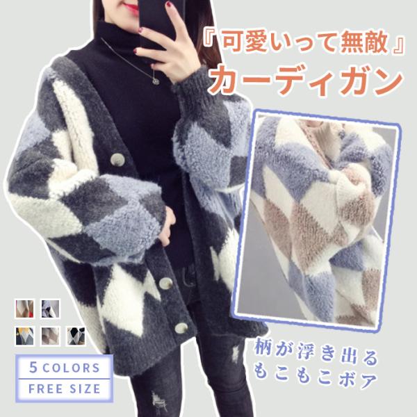 ・ 秋冬 人気の アーガイル柄 ボア カーディガン