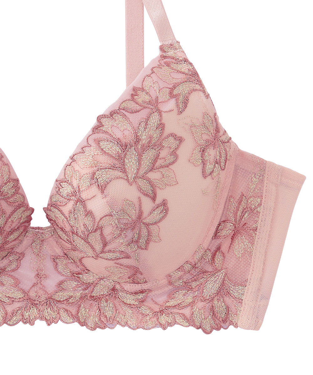 デザインにこだわった補整ブラとして大評判の脇高ブラジャー『バーレスクシリーズ』に、高級感のあるラメ糸でフラワー刺繍した可憐なデザインが登場。脇高ボーンと脇パワーパネルが脇肉をしっかり集めて寄せ上げ、脇スッキリ。サイドパネルは、バストの脇逃げをブロックし、さらにカップ上辺のレースがハミ肉をしっかりカバーします。カップの形は自然な丸みのあるモールドカップを採用し、エレガントな花柄が浮き出るレースデザインが大人可愛いブラジャー&ショーツセットです。