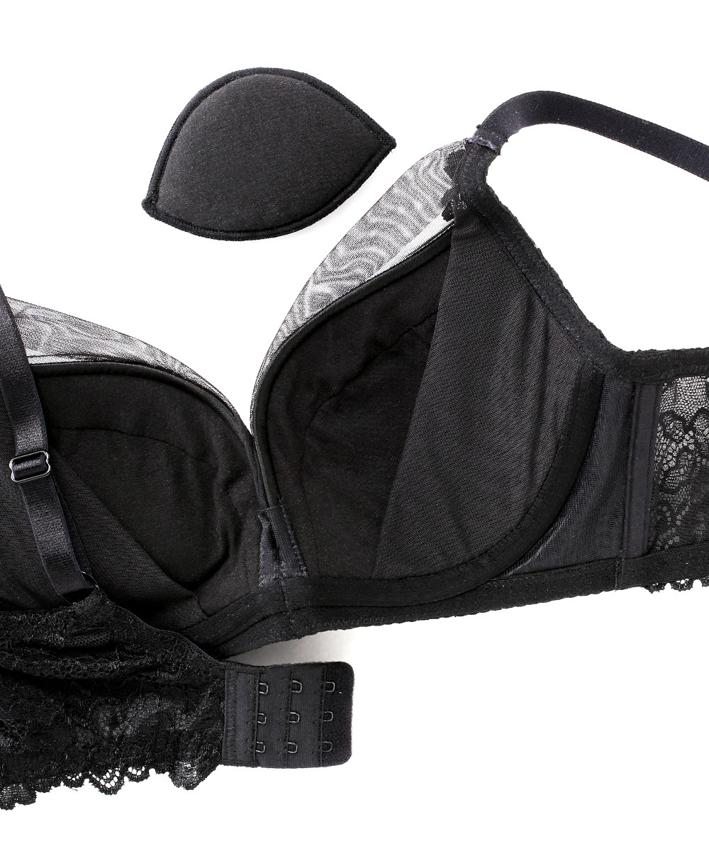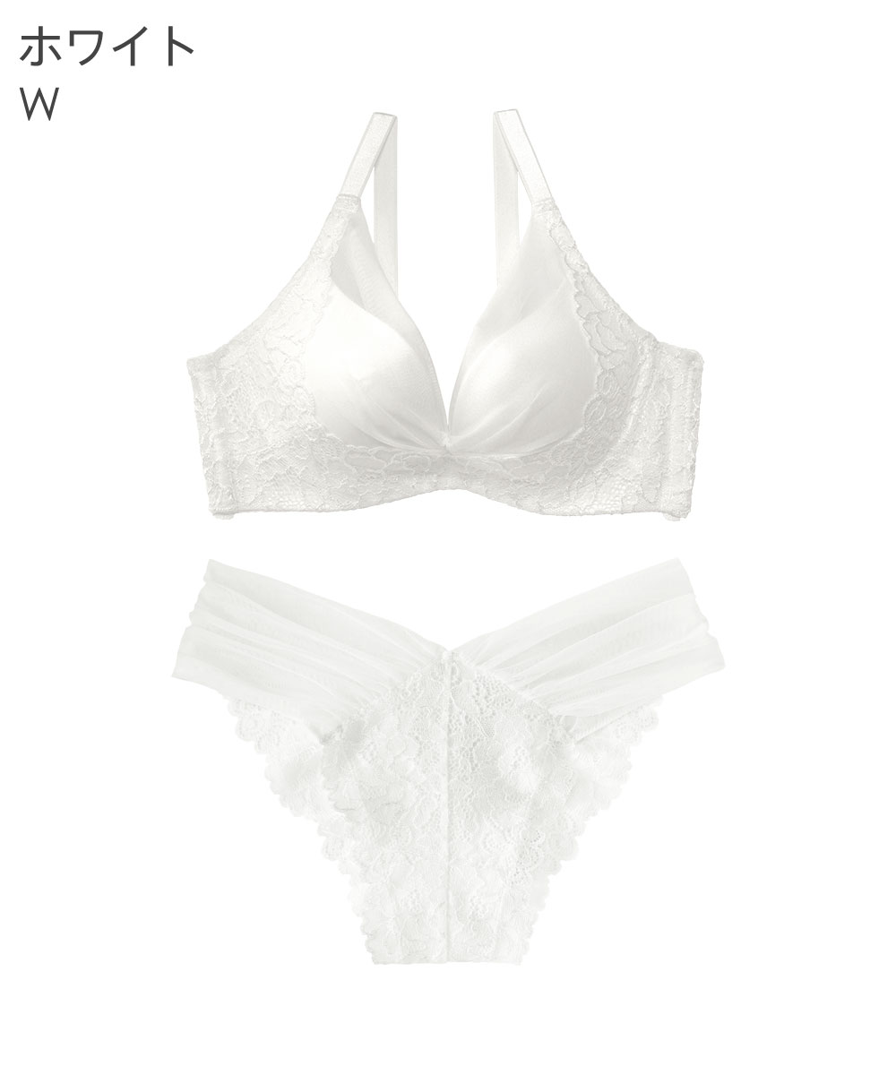 バストが上がる×寄る!重力に負けずキレイな谷間をメイク!美しいシルエットをつくる進化したaimerfeelの脇高ブラとハーフバックショーツのセットが登場。痛くなりにくいL字ワイヤー採用で、補整ブラなのに着け心地も楽ちん。脇高ボーンで脇肉を寄せ上げ、脇肉すっきり。カップサイドのレースパネルはバストを上に引き上げるリフトアップ効果も。カップ裏はパワーネット×サイドパネルでバストの脇逃げを防ぎ、寄せた谷間をしっかりキープします。艶のあるサテンカップにチュール素材を重ね、カップのサイドからバックベルトに続く繊細な花柄レースが上品でエレガントなデザインに仕上げました。カラーはモノトーン系のホワイト、グレー、ブラックと、落ち着いた大人カラーのピンクベージュ、ガーネット、クラシックブルーなど。