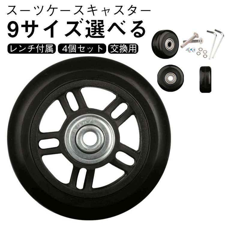 | スーツケースキャスター 交換用 4個セット 9サイズ選べる 動きが悪くなったり、劣化・破損したキャリーケースのタイヤを ご自身で交換できる交換用タイヤキットです。 以下のことにお困りの方に最適な一品です。 ・スーツケースが壊れた。 ・新品を買いたいけど、高いから迷っている。 ・メーカー修理を申し込んだら、高くてびっくりした。 ・地元のホームセンターに修理キットがない。 ●取りはずし簡単、とりつけ簡単 素人でも簡単に取付できます。工具を使って古いタイヤを取り出して、あたらしく取り付けるだけです。 ●スムーズに動く タイヤの内部にベアリングを内蔵しています。 スーツ―ケースを引っ張る際も、スムーズに動きます。 ●選べるタイヤサイズと安心の静音設計 選べるタイヤサイズは、直径40mm、45mm、50mm、54mm、58mm、60mm、63mm、70mm、75mmの4種類。大きいサイズから小さいサイズまで、あなたのスーツケースに合う車輪が見つかります。スーツケースタイヤ、スーツケースキャスターの交換に特化した、まさに交換セットです。種類も豊富に取り揃えています。 ●静音タイプのタイヤ クッション性の高い、高品質のゴム素材を採用しています。 磨耗しにくい静音タイプです。空港やホテルなど様々な路面に対応します。 ■取付方法 1 交換前のタイヤを電動ノコギリ、金属用ノコギリ、工具などで切断して下さい。 2 切断後にタイヤと車軸を取り外して下さい。 3 新しいタイヤと車軸(本商品)を取り付け、付属の六角レンチを使用してネジをしっかり固定して下さい。 ※車軸が長い場合はワッシャーを取り付けてサイズ調整して下さい。 | |