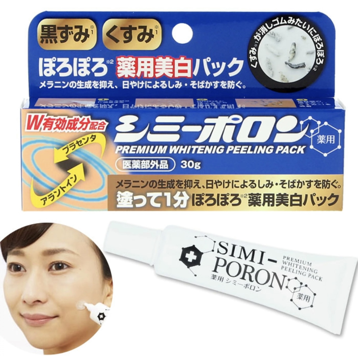 | 使用方法 | 1.気になる部分に薬用シミーポロンをチューブのノズルから適量、直接塗布してください。 2.塗布後、1分程度お待ちください。 3.塗布した薬用シミーポロンを指先でこするようにマッサージし、水またはぬるま湯で洗い流すかしっかりと拭きとってください。※通常のスキンケアを行うまえの素肌にご使用ください。 |