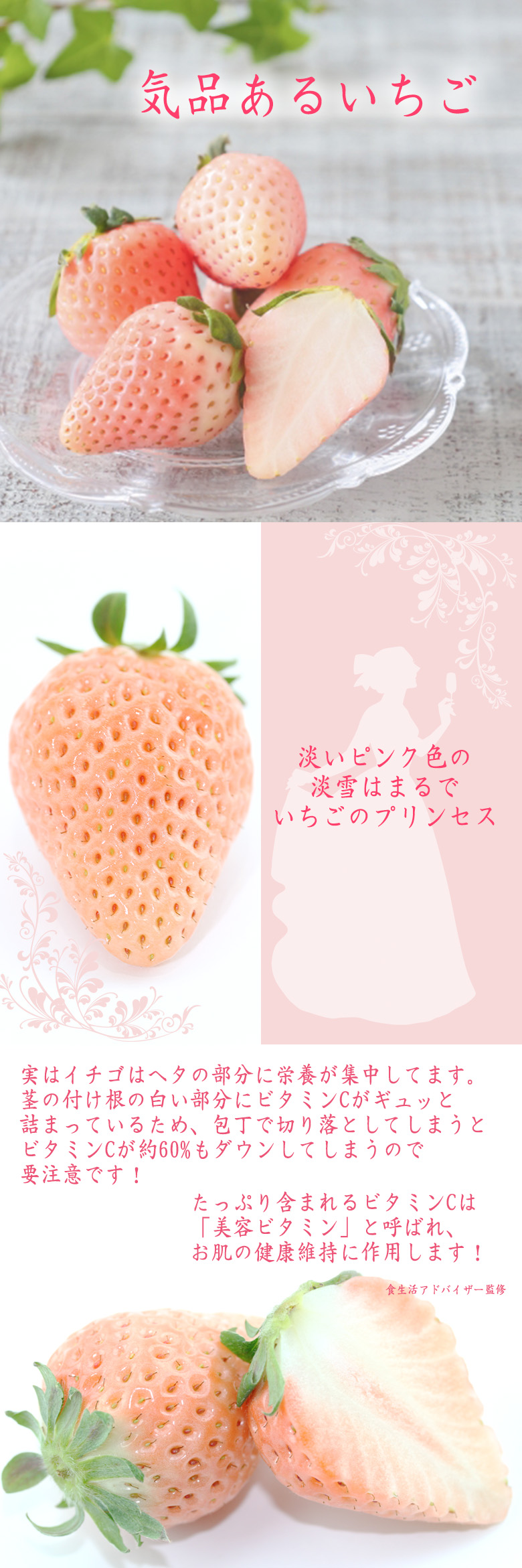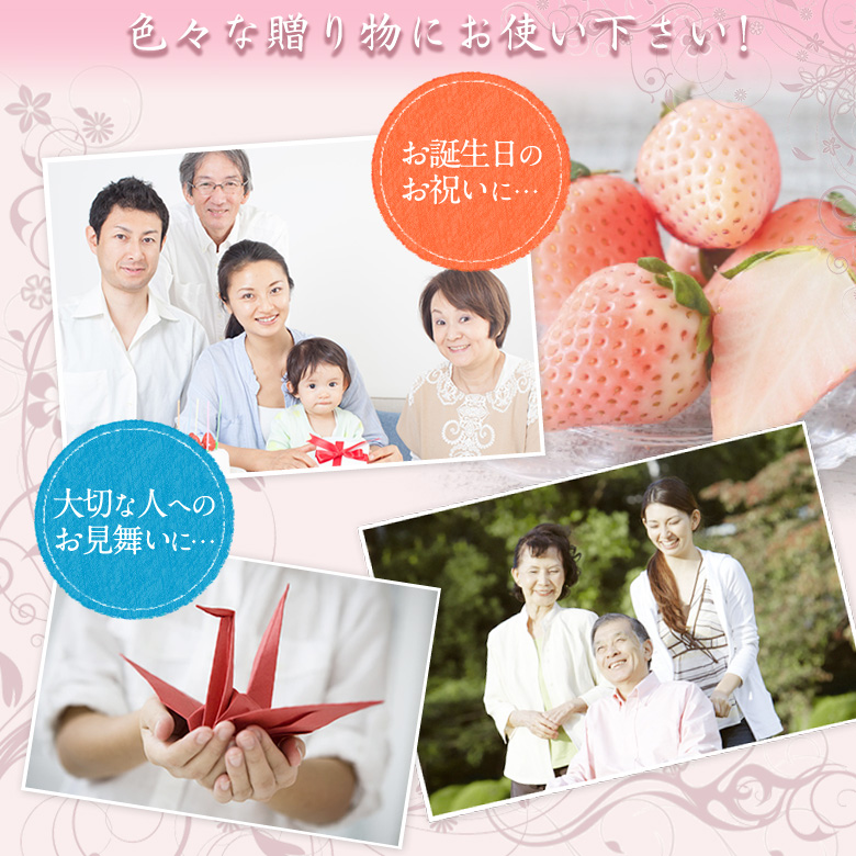 | 商品説明 | 【淡雪(あわゆき)】 (平成25)年12月に登録されたばかりの新品種。果皮は真っ白ではなくやや淡い桃色をしています。果肉は、ほんのり色づいていて、とても愛らしい見た目です。果肉はややかため。やさしいミルキーいちごの香りが部屋中に広がります。 糖度は13〜15度 で、酸味は少ない甘いいちごです。 |