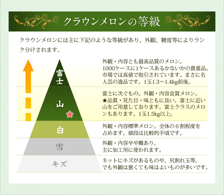 | 商品説明 | 等級【山】…山の中でも上等の味・外観のもの 果物の王様マスクメロン。その中でも1本の木で1つの果実だけを育て、全栄養を注ぎ込んで作ることで最高の名を冠せられているのがクラウンメロンです。 メロンに貼ってある王冠のシールは、外観・内容・糖度などの厳しい検査に合格したもののみに与えられるクラウンメロンの証です。 大切な方への贈り物として大変人気の高いクラウンメロン。 ご自宅でも味・香・肉厚・果肉汁どれもすばらしいクラウンメロンをぜひご堪能ください。 マスクメロン アドバイザーが、ご利用日に合わせて食べごろを厳選し、お送り致します。 |