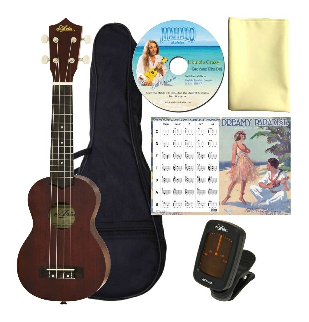 ※画像は撮影用商品のため、お届けの際の商品とは異なります。★セット内容★ ウクレレ本体:ARIA AU-1 ソフトケース:付属品 ウクレレ専用チューナー:ARIA ACT-UK お手入れクロス:マイクロファイバークロス 教則DVD:MAHALO UKULELE CRAZY!(英語版/日本語字幕) ウクレレコード表付 クリアファイル:KIWAYA File※クリアファイルの柄は4種類の中から当店がお選びします。 // シンプルなデザインとつや消し塗装により、落ち着いた雰囲気を醸し出すソプラノ・ウクレレ。マホガニー材の採用による柔らかく甘いサウンドが特徴です。ギア式ペグの採用によるチューニングのしやすさも魅力。Top:MahoganyBack&Sides:MahoganyNeck:OkoumeFingerboard:RosewoodFrets:12FBridge:RosewoodNut&Saddle:BoneNut width:38 mmFinish:Open Pore,MattStrings:Aquila’Super Nylgut’ご注意木部分には木目、色味等の個体差があり、掲載の商品画像と異なる事がございます。また、ディスプレイの違いにより、実際の色と異なって見える場合がございます。掲載されている内容は品質