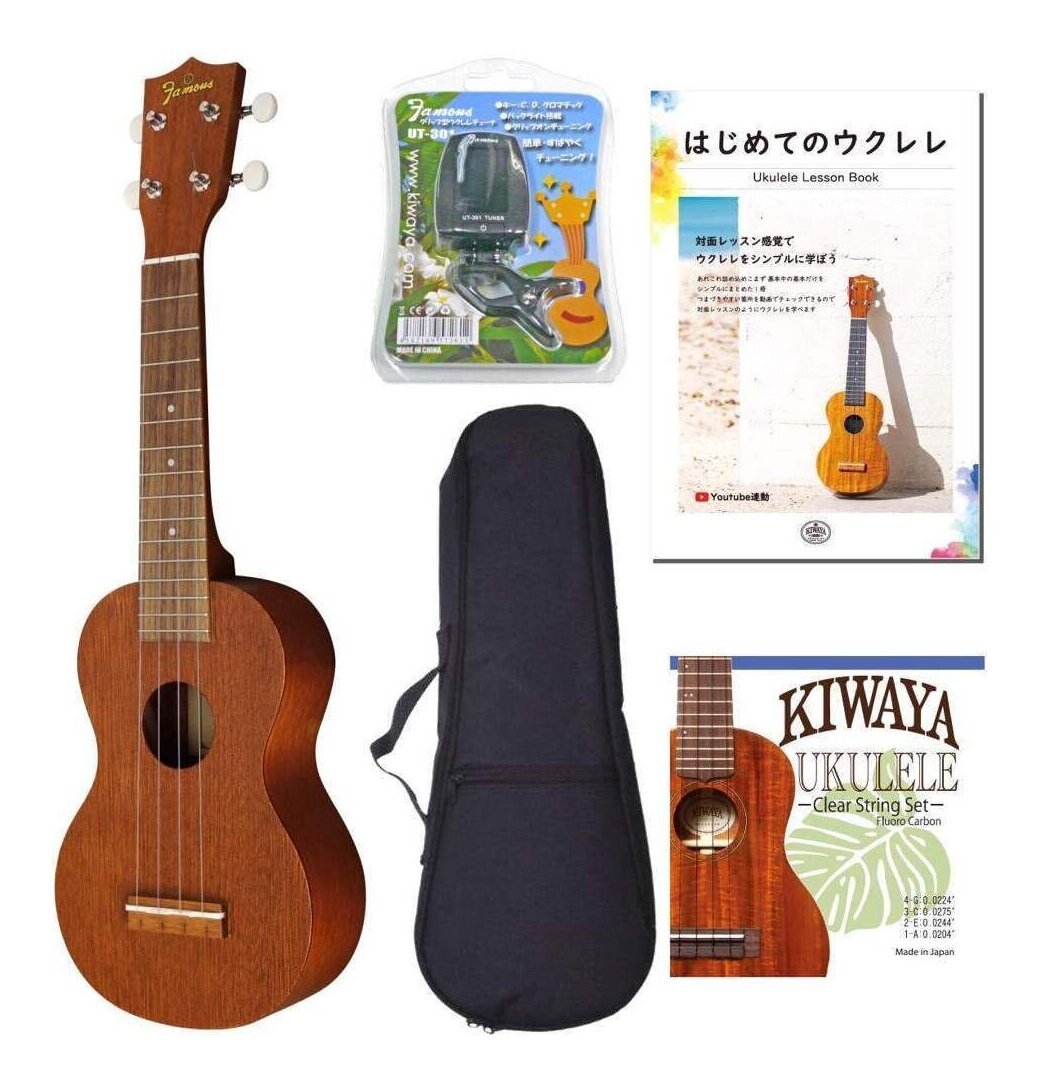 ※画像は撮影用商品のため、お届けの際の商品とは異なります。 ★セット内容★ 本体:Famous FS-1G ギグバッグ:KIWAYA ウクレレギグバッグ※ギグバッグは画像と異なる場合がございます。 スペア弦:KIWAYA KFC SET クリップチューナー:Famous UT-301 教則本:Famous はじめてのウクレレ // ★商品の説明★★国産一流ウクレレ・メーカー・フェイマスのFS-1(ソプラノウクレレ)のギアペグ採用モデルです。日本製でしっかりした作りをしており、シンプルなデザインながらも楽器としての質は十分納得のいくモデルです!★マホガニー材合板、 15 フレット、キワヤオリジナルギアペグ仕様のソプラノウクレレ※ 掲載したすべての商品は、画像処理の都合上、実際の商品と見た目が違う場合がございます。予めご了承下さい。※ウクレレは個体差があり、木目・色合いは個々に異なります。