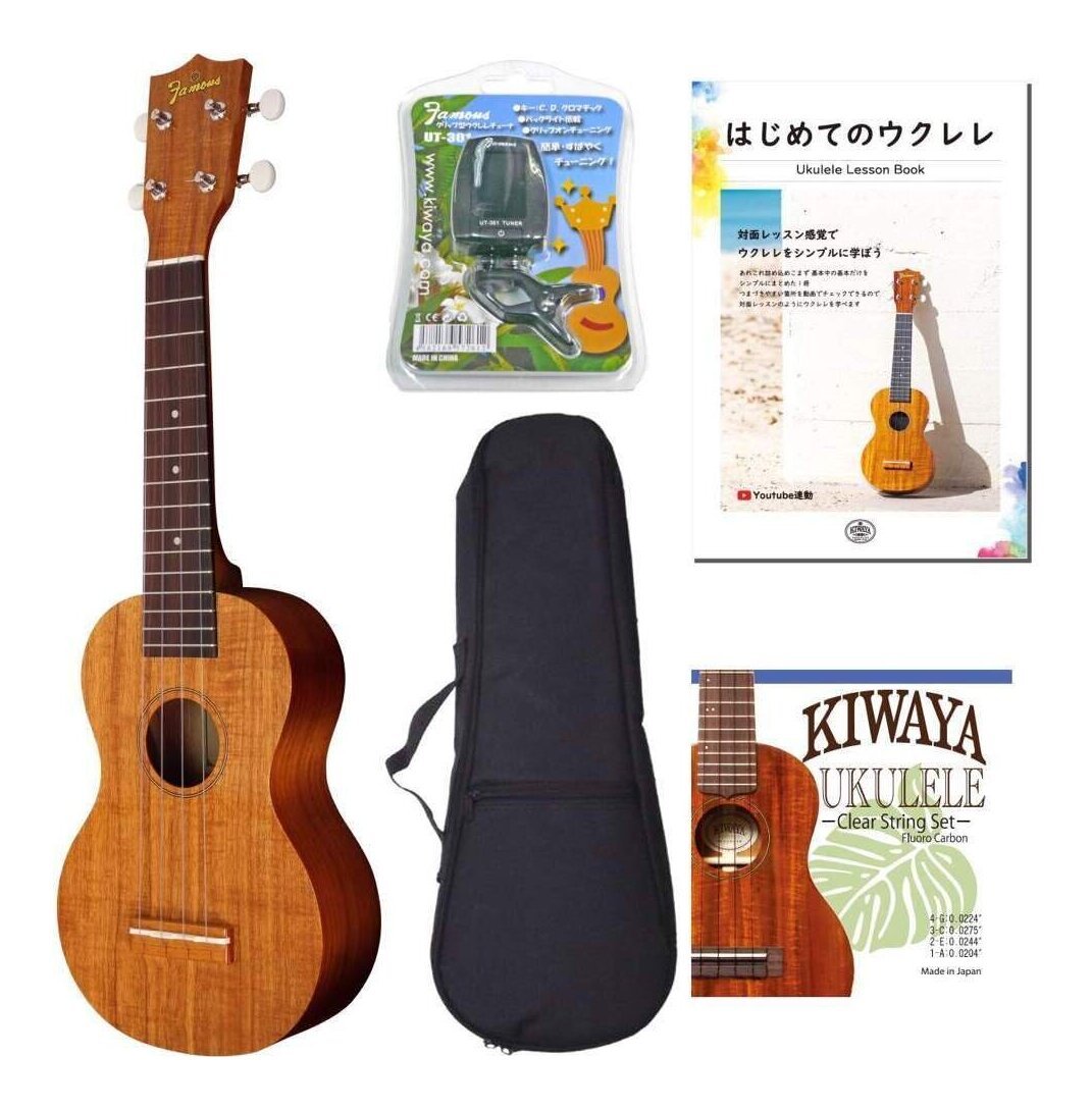 ※画像は撮影用商品のため、お届けの際の商品とは異なります。 ★セット内容★ 本体:Famous FS-5G ギグバッグ:KIWAYA ウクレレギグバッグ※ギグバッグは画像と異なる場合がございます。 スペア弦:KIWAYA KFC SET クリップチューナー:Famous UT-301 教則本:Famous はじめてのウクレレ // ★商品の説明★人気モデルFS-5のギアペグ仕様!オリジナルペグを搭載することにより通常のフリクションペグよりチューニングの精度があがりました。仕様ソプラノウクレレタイプ材:ハワイアン・コア材合板フレット数:15ペグ:キワヤオリジナルギアペグ仕様※ 掲載したすべての商品は、画像処理の都合上、実際の商品と見た目が違う場合がございます。予めご了承下さい。※ウクレレは個体差があり、木目・色合いは個々に異なります。