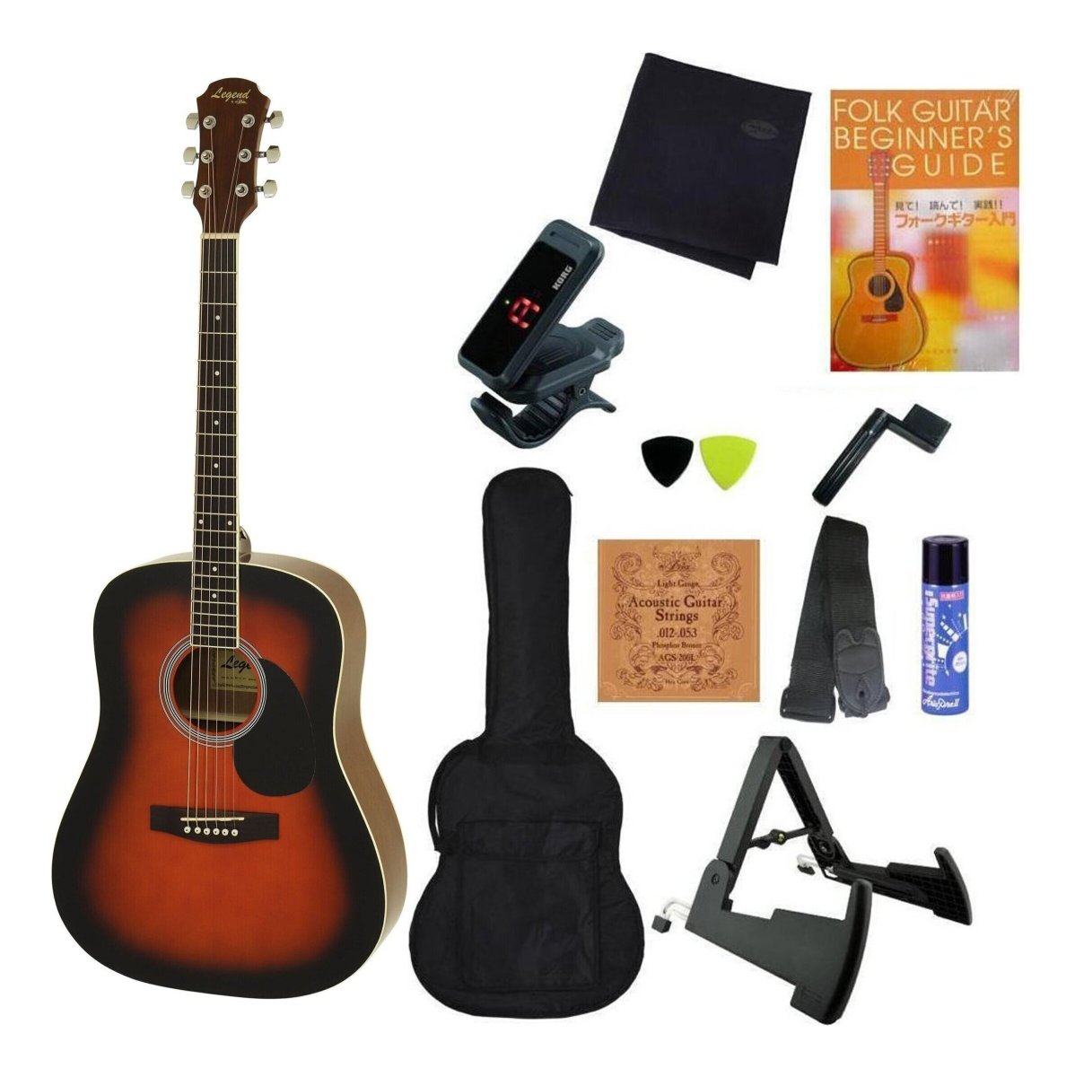 ※画像は撮影用商品のため、お届けの際の商品とは異なります。こちらの商品は一部の地域*を除き送料無料(送料込)です。*離島地域・北海道・沖縄へのお届けは別途、送料が必要になりますので、ご注文の前にご連絡下さい。送料をお知らせいたします。★セット内容★ ◆ギター本体:Legend WG-15 ◆ソフトケース:付属品 ◆チューナー:KORG pitchclip ◆ストラップ:ギターを肩にかける為のものです。 ◆クロス:本体を拭く布です。 ◆ストリングワインダー:弦を巻く道具です。 ◆ピック2枚:弦を弾くものです。消耗品です。 ◆スペア弦:弦は定期的に交換しましょう。 ◆ポリッシュ:ギターの汚れを取ります。 ◆ギタースタンド:ギターを立てかけるスタンドです。 ◆教則DVD:初心者に易しい内容です。 // 高いコストパフォーマンスが自慢のレジェンドアコースティック。WG-15はスタンダードなドレッドノートタイプ。初めてギターを触る方へはもちろん、気軽に弾けるギターが欲しい方へもお勧めです。 SpecificationsTop: Spruce Back&Side: AgatisNeck: Cata