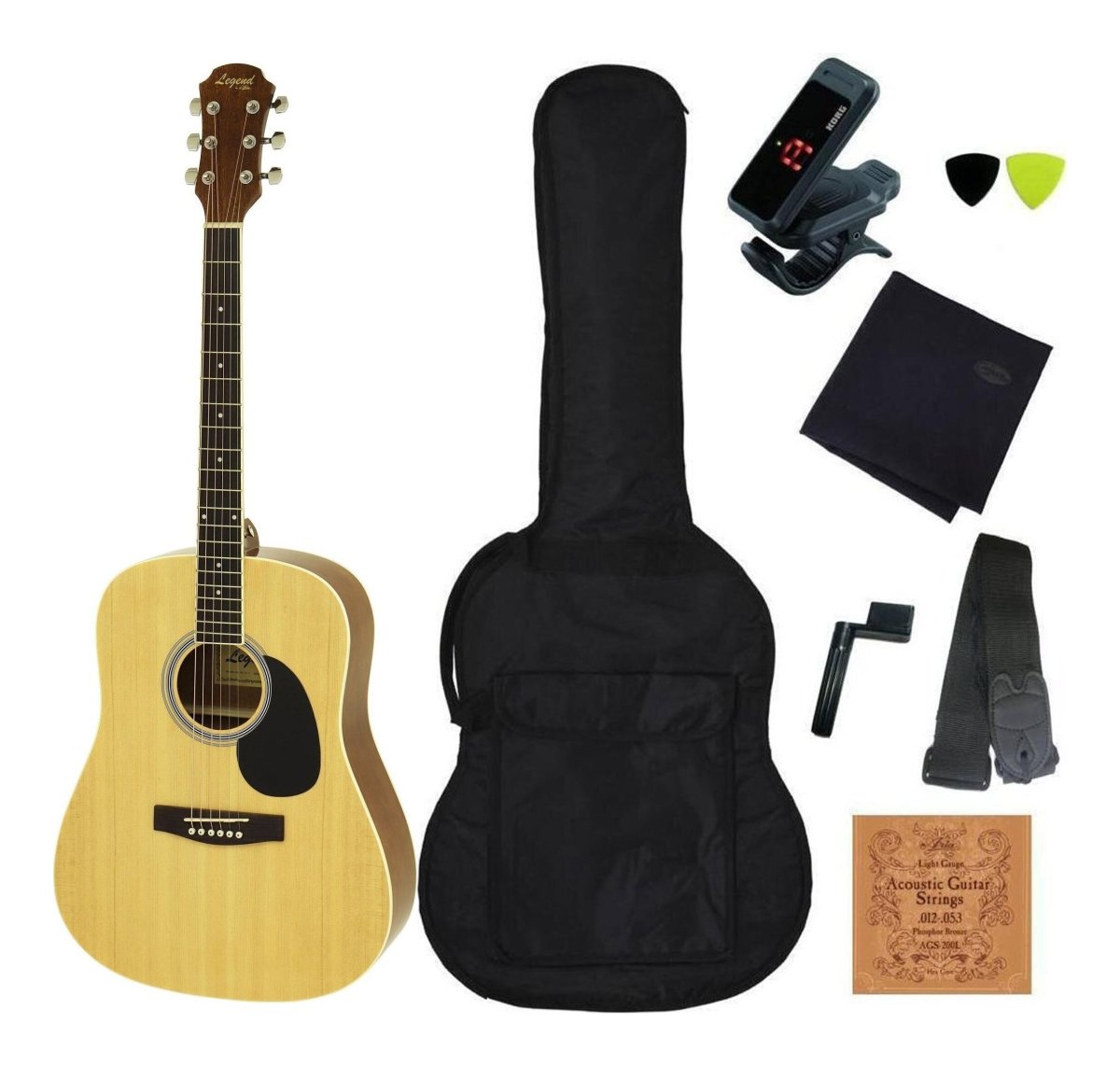 ※画像は撮影用商品のため、お届けの際の商品とは異なります。こちらの商品は一部の地域*を除き送料無料(送料込)です。*離島地域・北海道・沖縄へのお届けは別途、送料が必要になりますので、ご注文の前にご連絡下さい。送料をお知らせいたします。★セット内容★ ◆ギター本体:Legend WG-15 ◆ソフトケース:付属品 ◆チューナー:KORG pitchclip ◆ストラップ:ギターを肩にかける為のものです。 ◆クロス:本体を拭く布です。 ◆ストリングワインダー:弦を巻く道具です。 ◆ピック2枚:弦を弾くものです。消耗品です。 ◆スペア弦:弦は定期的に交換しましょう。 // 高いコストパフォーマンスが自慢のレジェンドアコースティック。WG-15はスタンダードなドレッドノートタイプ。初めてギターを触る方へはもちろん、気軽に弾けるギターが欲しい方へもお勧めです。 SpecificationsTop: Spruce Back&Side: AgatisNeck: CatalpaFingerboard:RosewoodScale: 650mmNut width: 43mm Bridge:Rosewoo