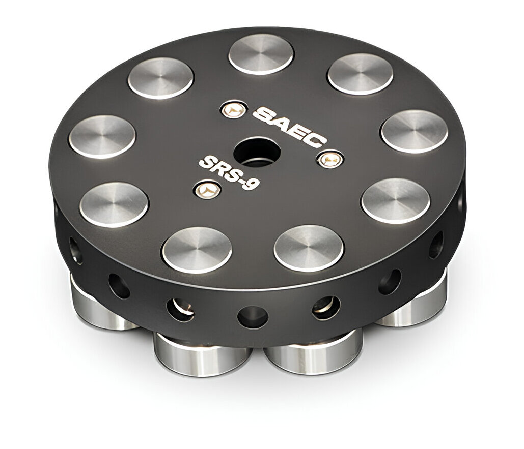 こちらの商品は一部の地域*を除き送料無料(送料込)です。*離島地域・北海道・沖縄へのお届けは別途、送料が必要になりますので、ご注文の前にご連絡下さい。送料をお知らせいたします。SVM(Suppress Vibration Material)機構搭載高性能レコードスタビライザーSRS-9はこれまでの製品にはない、SVM(Suppress Vibration Material)機構を採用した革新的なレコードスタビライザーです。SVM機構とは、9個のステンレス製のセパレートウエイトを搭載するその構造に特徴があり、レコードの盤面の微細なそりに応じてそれぞれのウエイトが最適な荷重を与えるため、レコード盤全体をフラットに保ち、効果的に振動を抑制することができます。またこうした方法を用いることで、カートリッジの針先がレコード溝をトレースする際、針先に与える余計な振動から解放され、音溝に刻まれた信号を余すことなくピックアップすることが可能になります。その結果、S/N比が高まるとともに空間の表現力も向上、優れた音を構築します。また、重量を300g以下に抑えた設計とすることで、トルクの