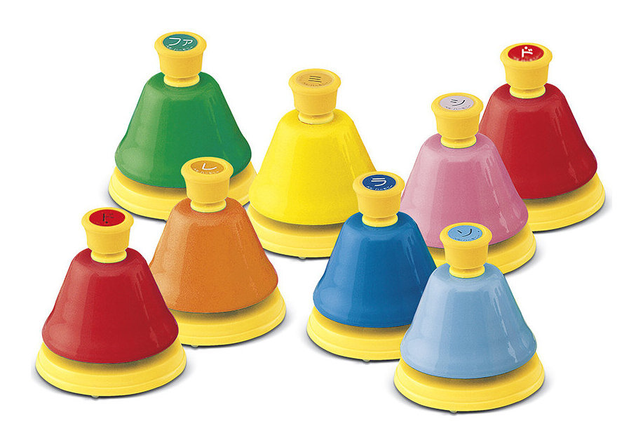 こちらの商品はお取り寄せとなります。3日〜1週間ほどでお届け可能です。メーカー品切の際はお時間を頂きます。こちらの商品は一部の地域*を除き送料無料(送料込)です。*離島地域・北海道・沖縄へのお届けは別途、送料が必要になりますので、ご注文の前にご連絡下さい。送料をお知らせいたします。基本セットベルハーモニー デスクタイプ(幹音)MBD-8ベルハーモニー・デスクタイプ全音域2オクターブの中心になる、1オクターブ幹音のみの8音セットです。概要机などの上に置き、キャップを叩いて演奏するベルです。置き方を工夫することで様々な演奏が可能で、動きやあそびの要素を取り入れやすいでしょう。また、ベルを持ち替える必要が無いので、一人でより多くの音を演奏できます、複数の楽器を担当しても良いでしょう。特長ベルハーモニーとは?色で音が分かるベルがセットにベルハーモニーは音別に色分けされたベルがセットになっています。ベルの色と音の関係は図の通りです。 幹音は単色、派生音は2トーン幹音はベルの色が単色で柄やキャップの色が黄色。派生音はベルの色が2トーンで柄やキャップの色が黒です。 ハンドタイプとデスクタイプの2種類