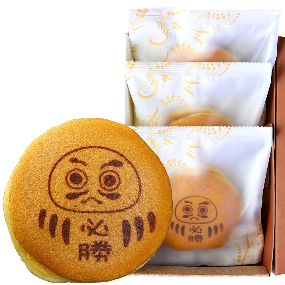 ※こちらのだるまどら焼きの文字は「必勝」のみです。だるまどら焼きの文字を変更はしたい場合は、別ページで販売中の「オリジナル 文字入れ だるま どら焼き」をご購入下さい。