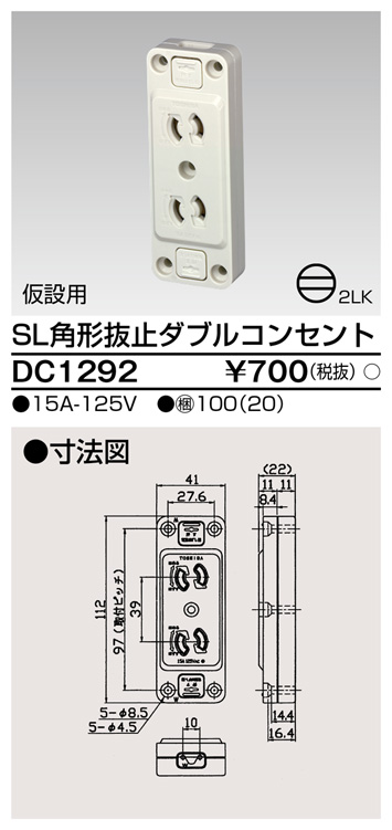 (手配品) SL角形抜止ダブルコンセント DC1292 東芝ライテック