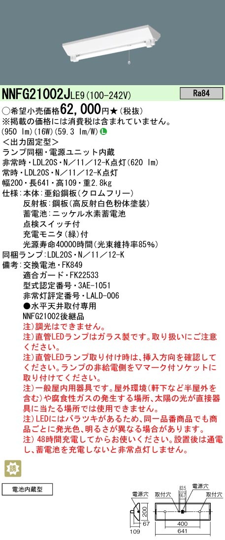 LED非常灯 NNFG21002JLE9 パナソニック LED非常照明 LDL20×1 20w型 (NNFG21002LE9の後