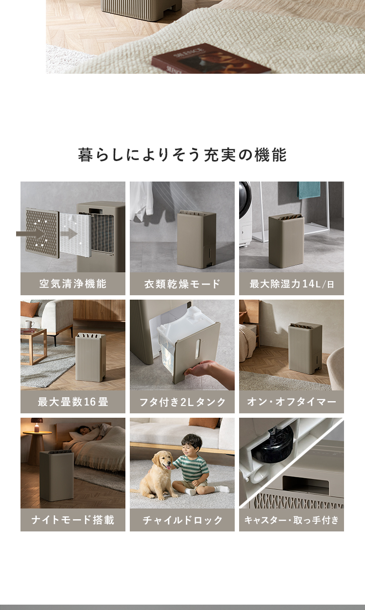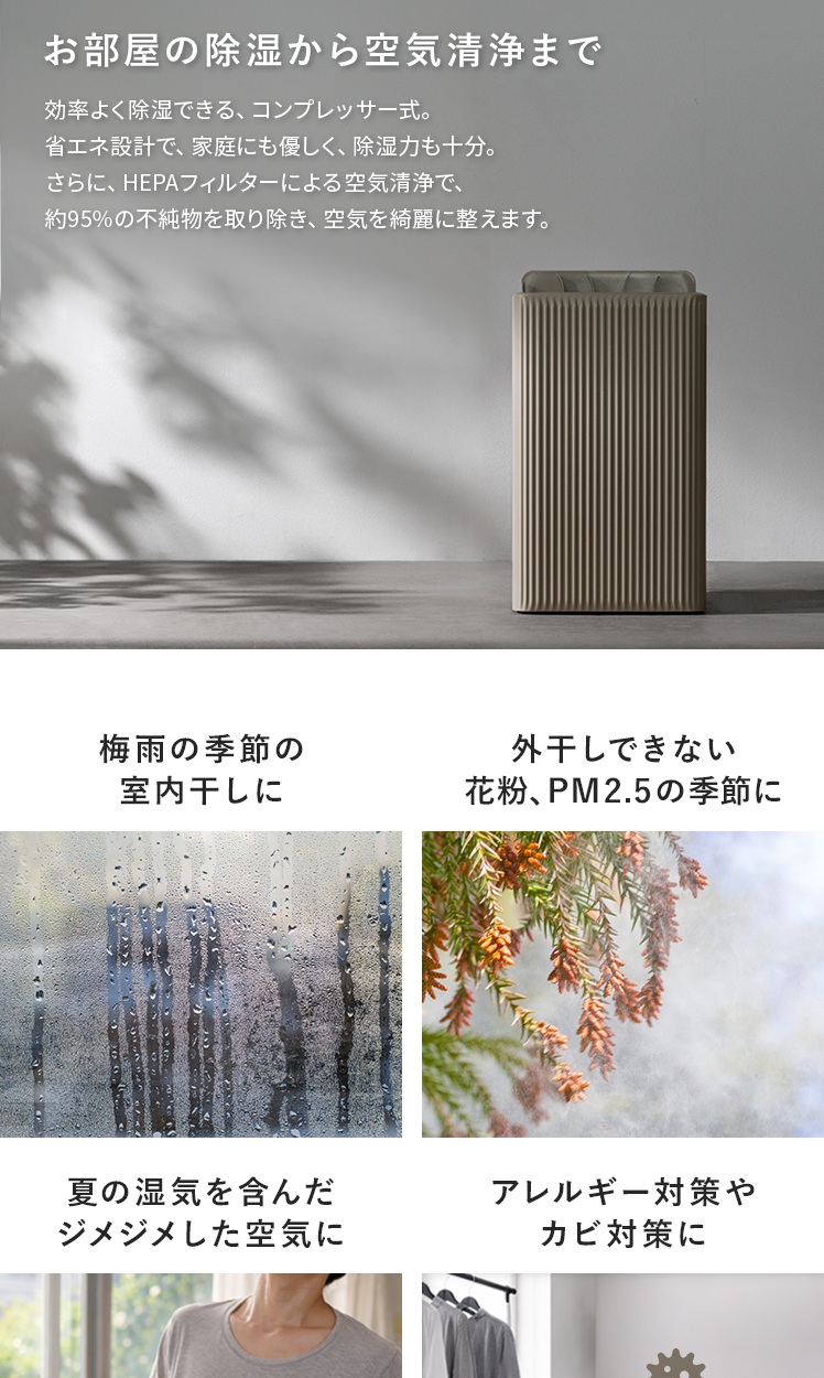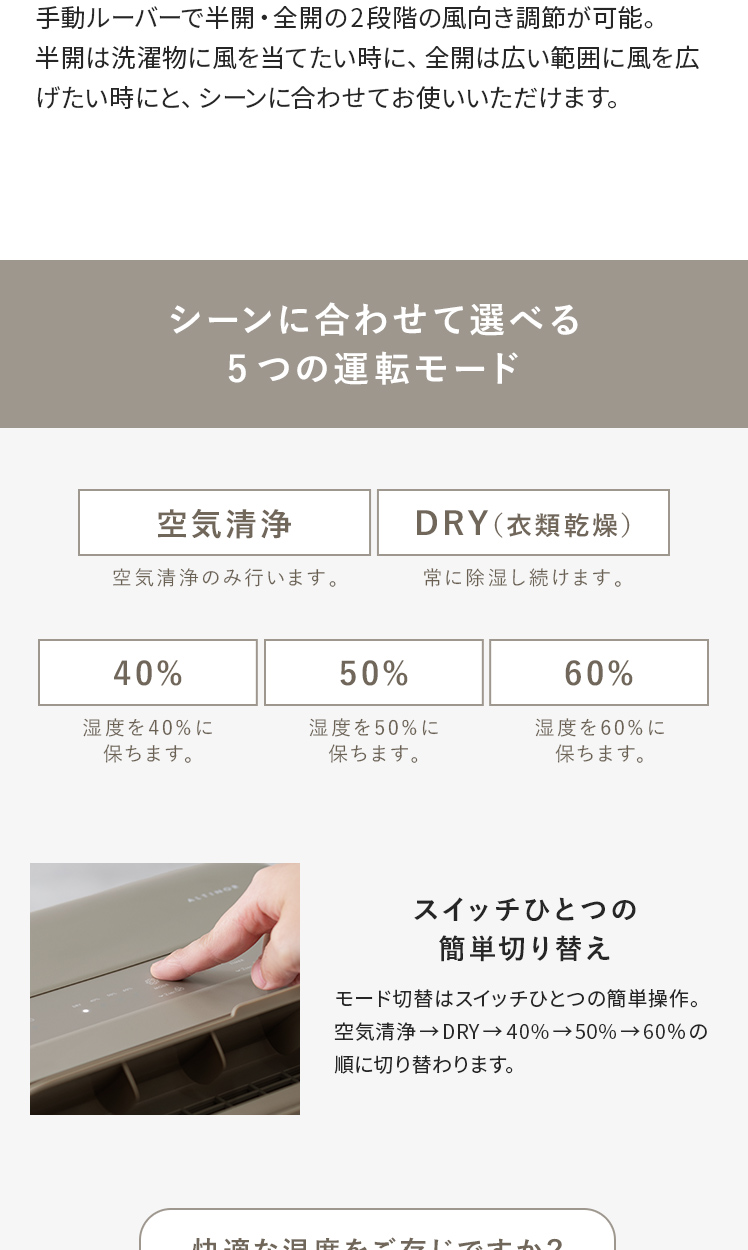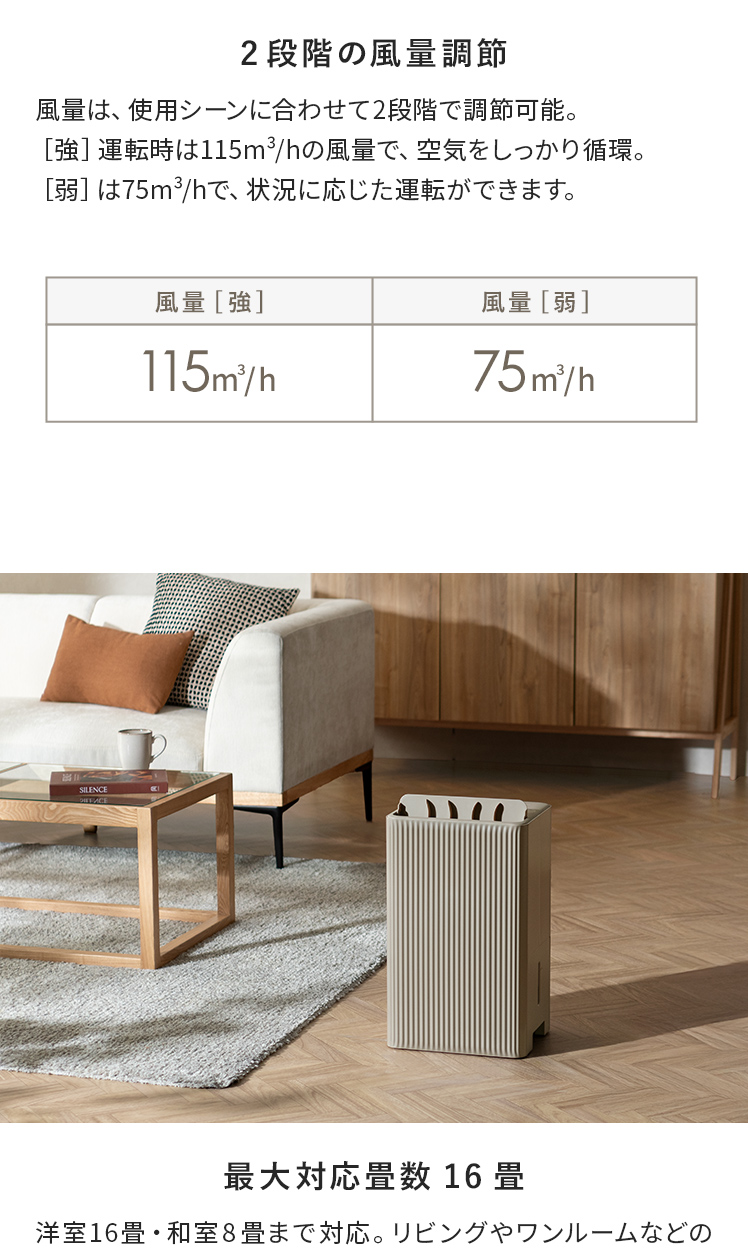 | 機能 | 空気清浄、衣類乾燥、風量2段階調整、モード切替、オン・オフタイマー、ナイトモード、チャイルドロック |