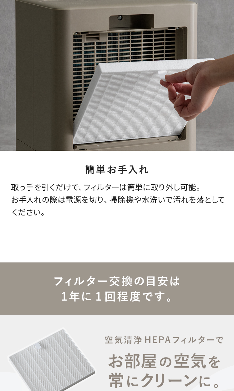 | 備考 | 1年保証(消耗品および付属品は除く)、PSEマーク付き商品 ※HEPAフィルターは、すべての粒子を除去できるわけではありません。 ※ドレンホースは付属しておりません。 |