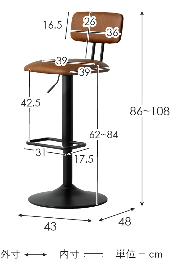 約幅43×奥行き48×高さ86~108cm