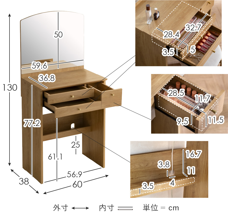 | 耐荷重 | 天板/約20kg、棚/約5kg、引き出し/各3kg、フック/各1kg |