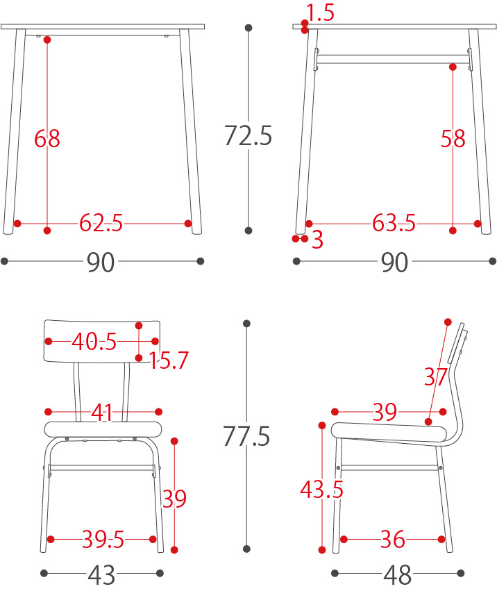 | サイズ | テーブル/約幅90×奥行き90×高さ72.5cm チェア/約幅43×奥行き48×高さ77.5cm |