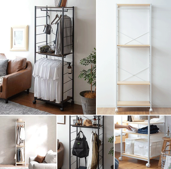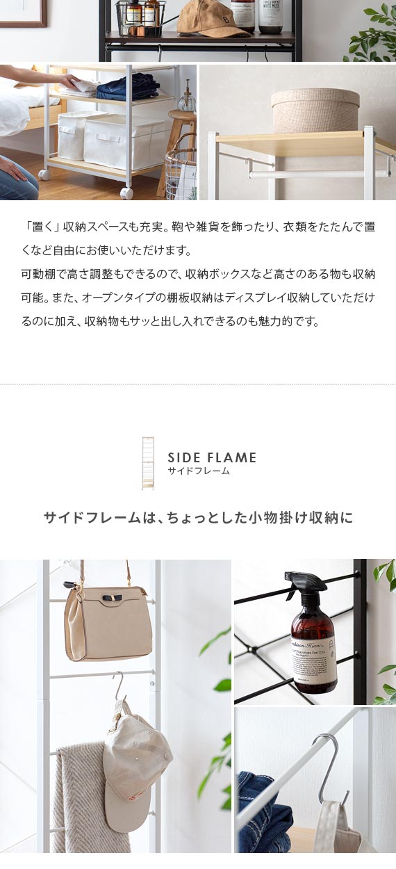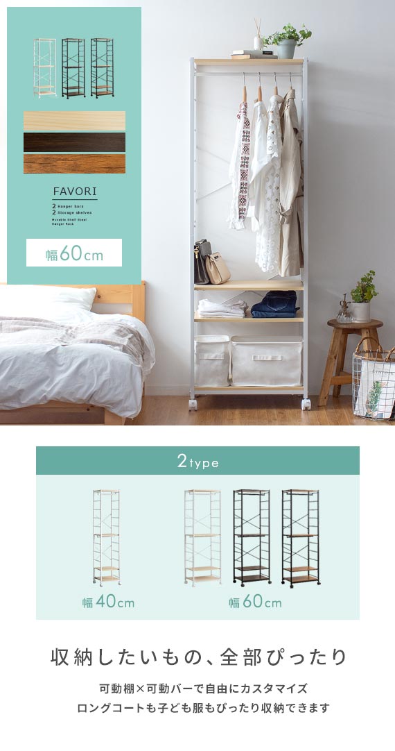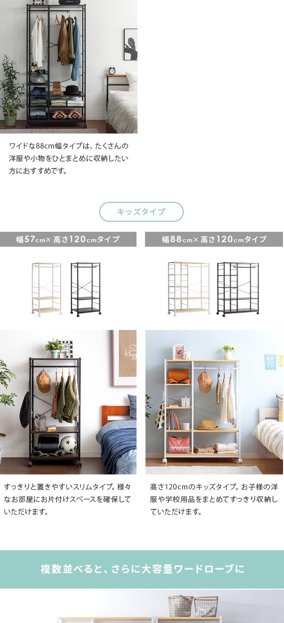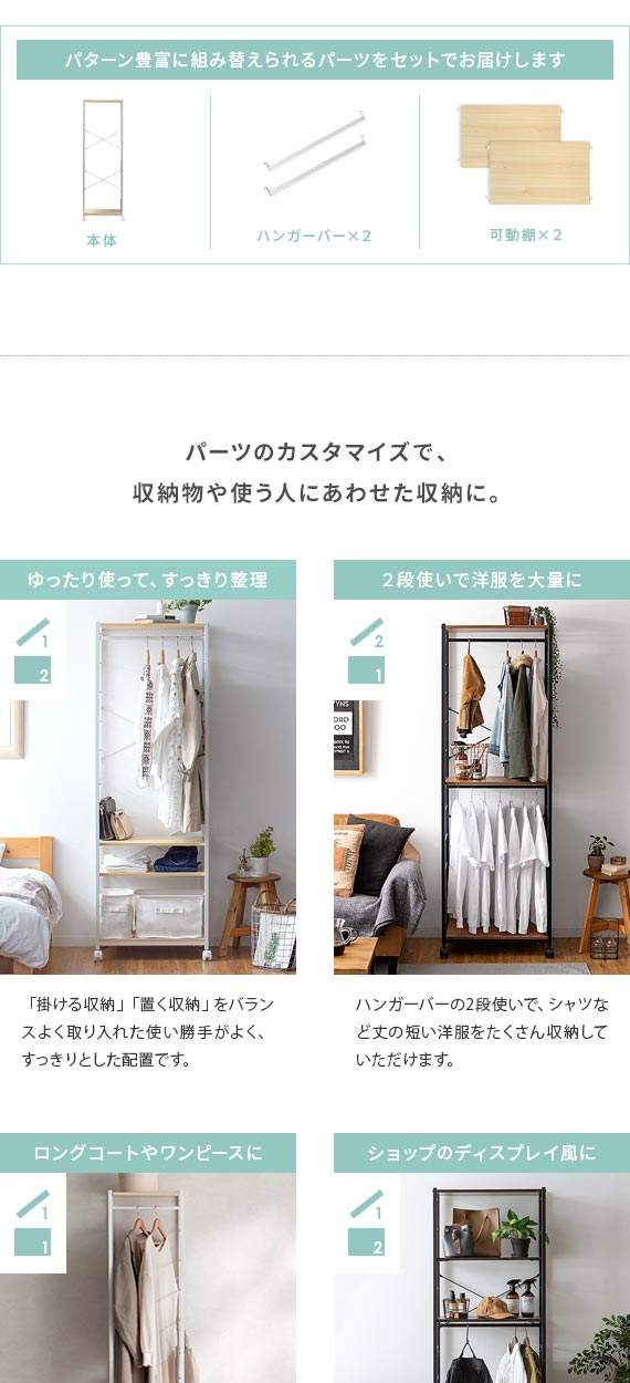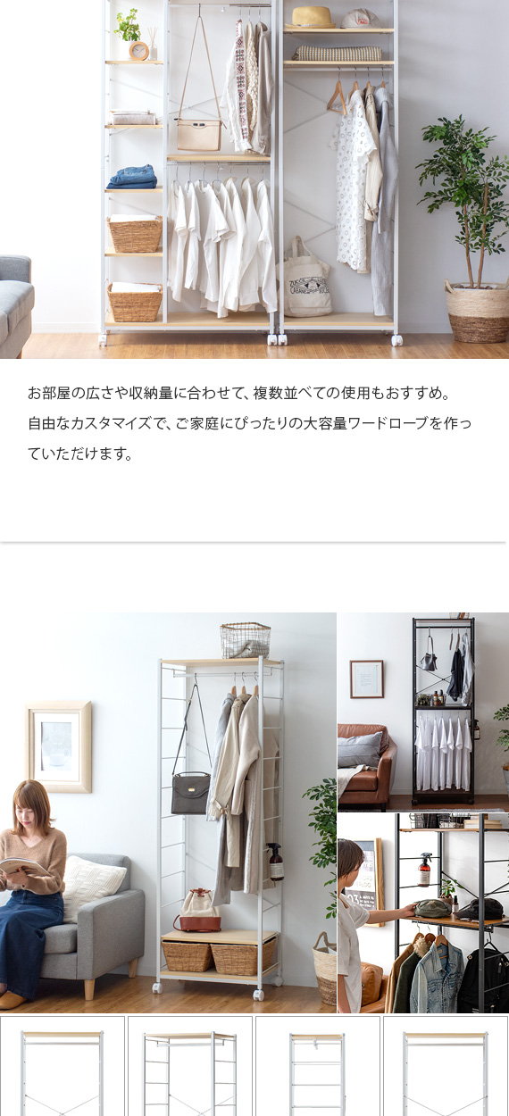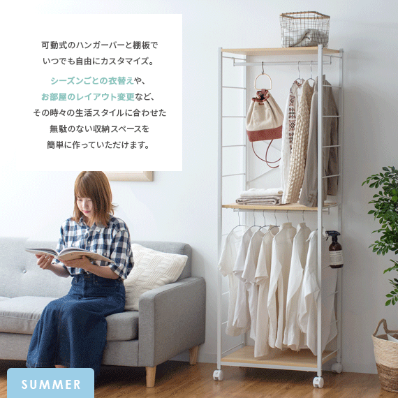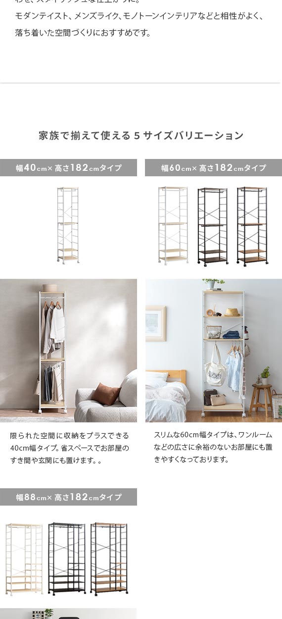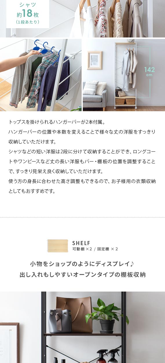 | 備考 | 組立式(組立て時間約45分) ※若干の個体差により、表記サイズと多少の差異が生じる場合がございます。 キャスター付き可動、バー2本、可動棚2枚付き |