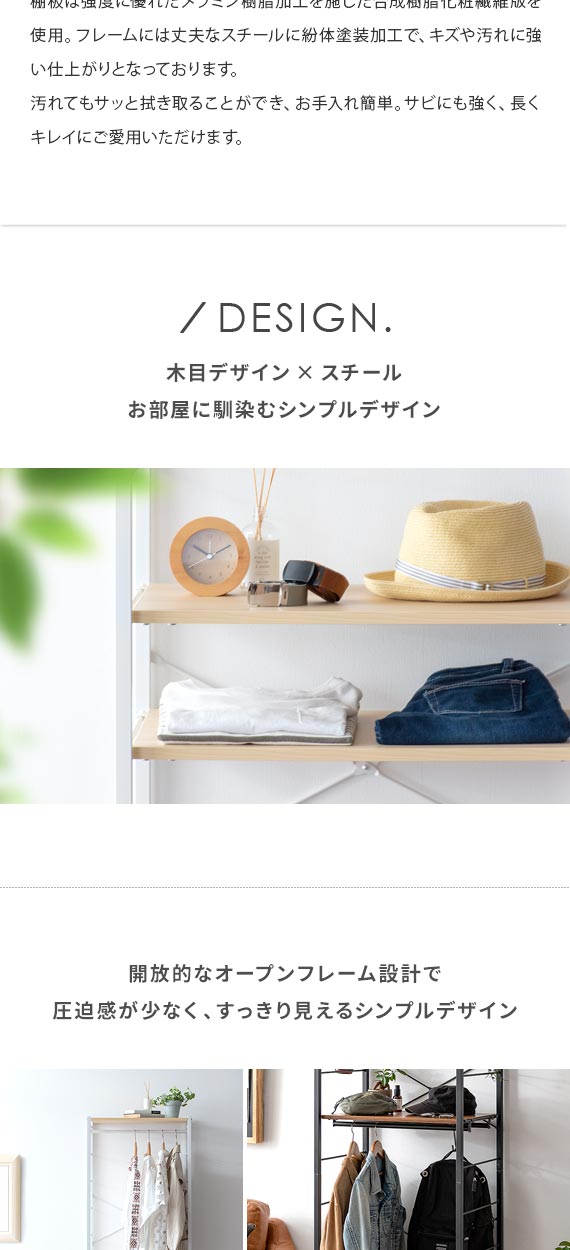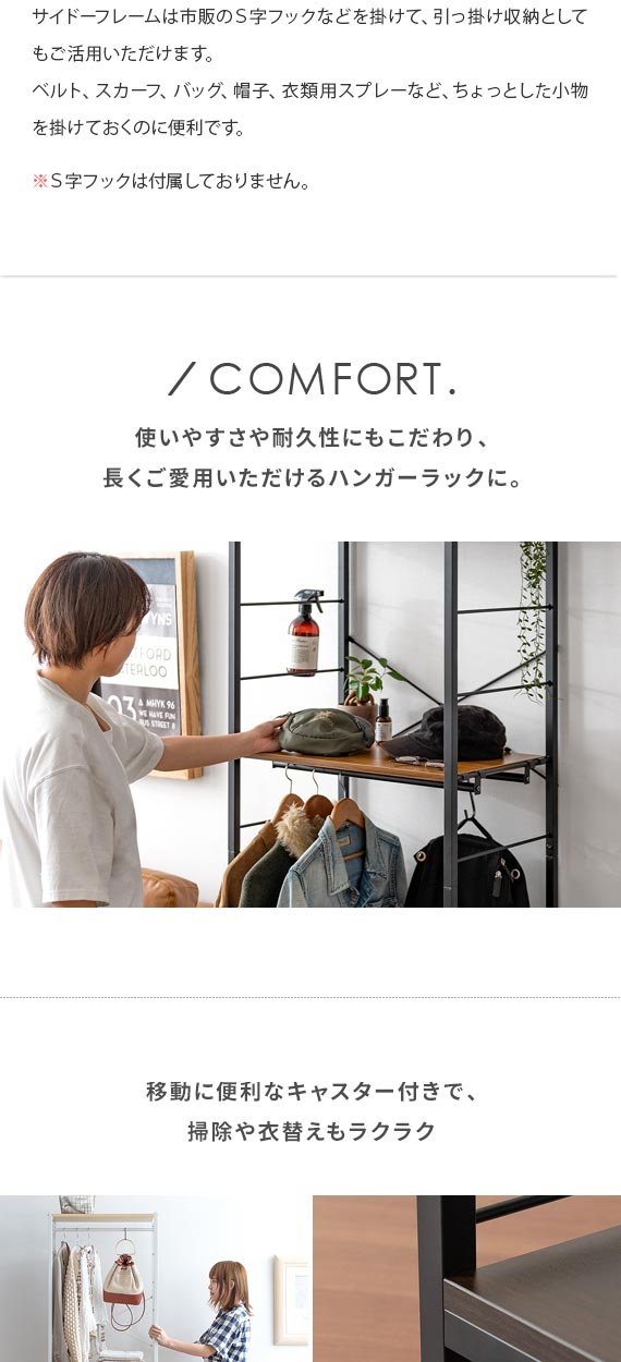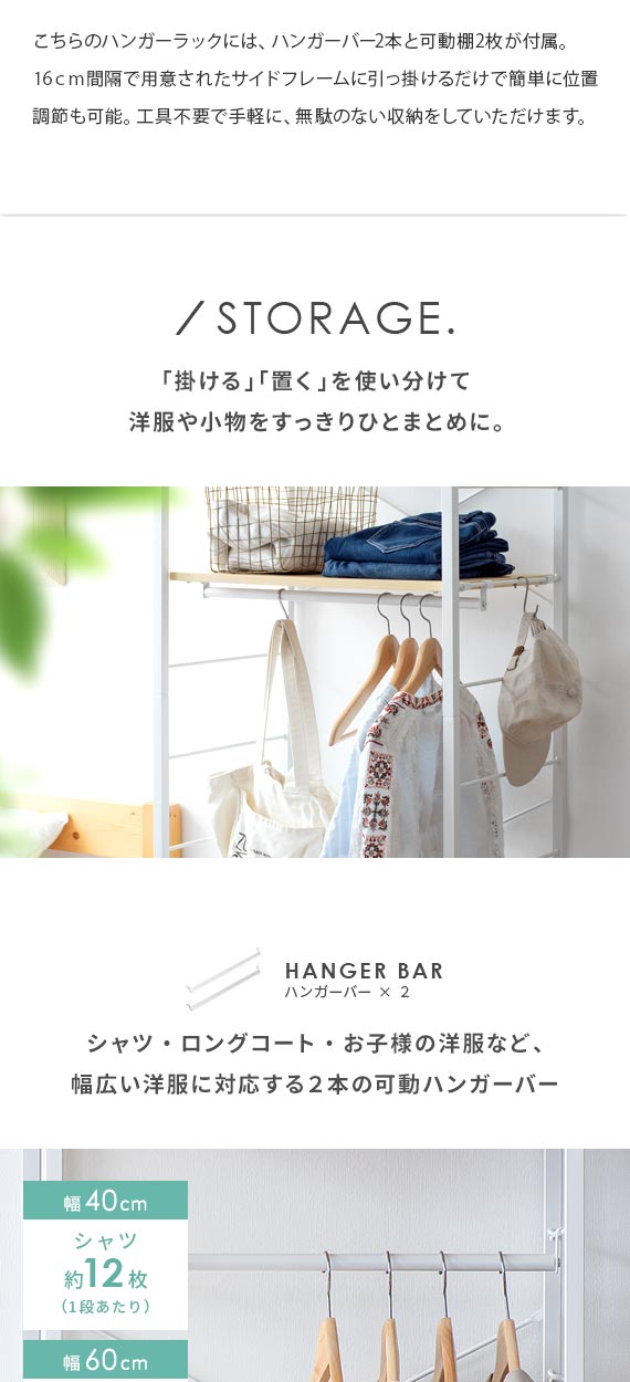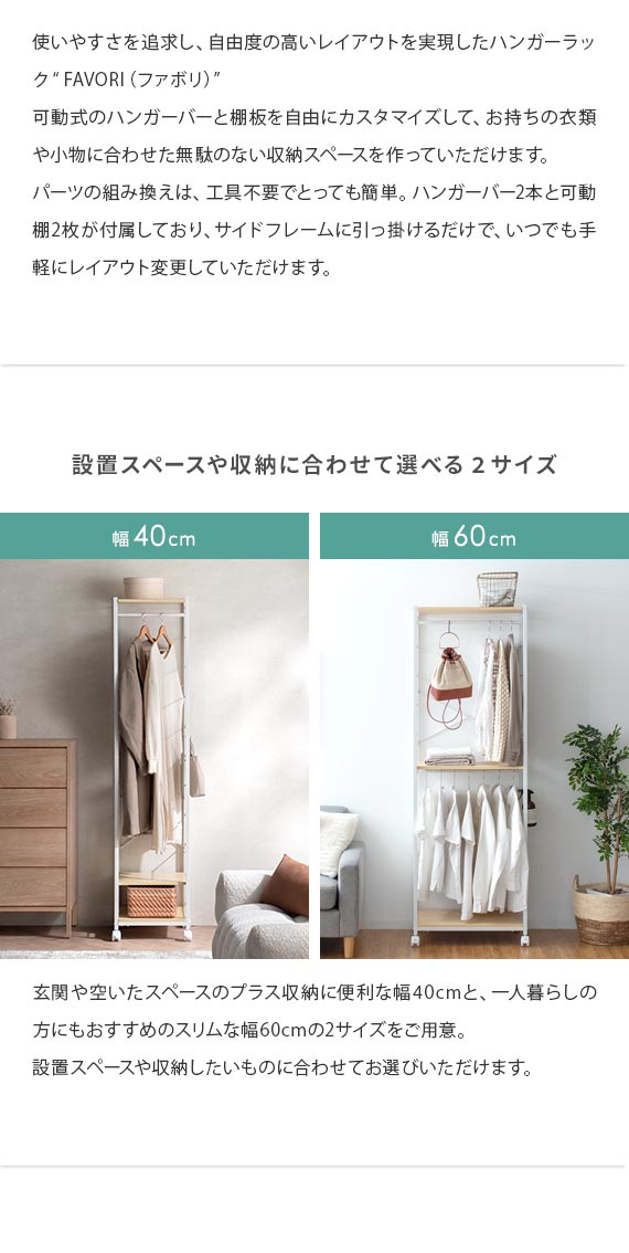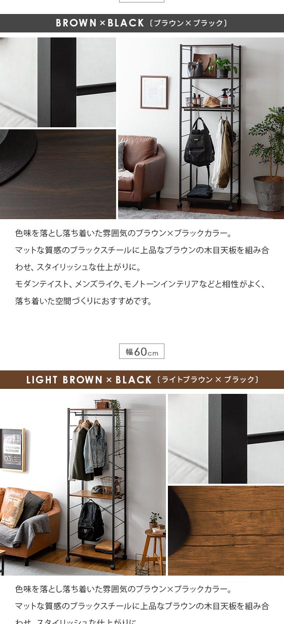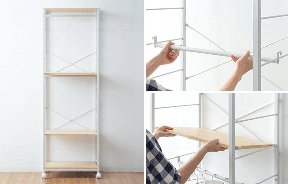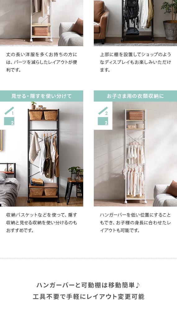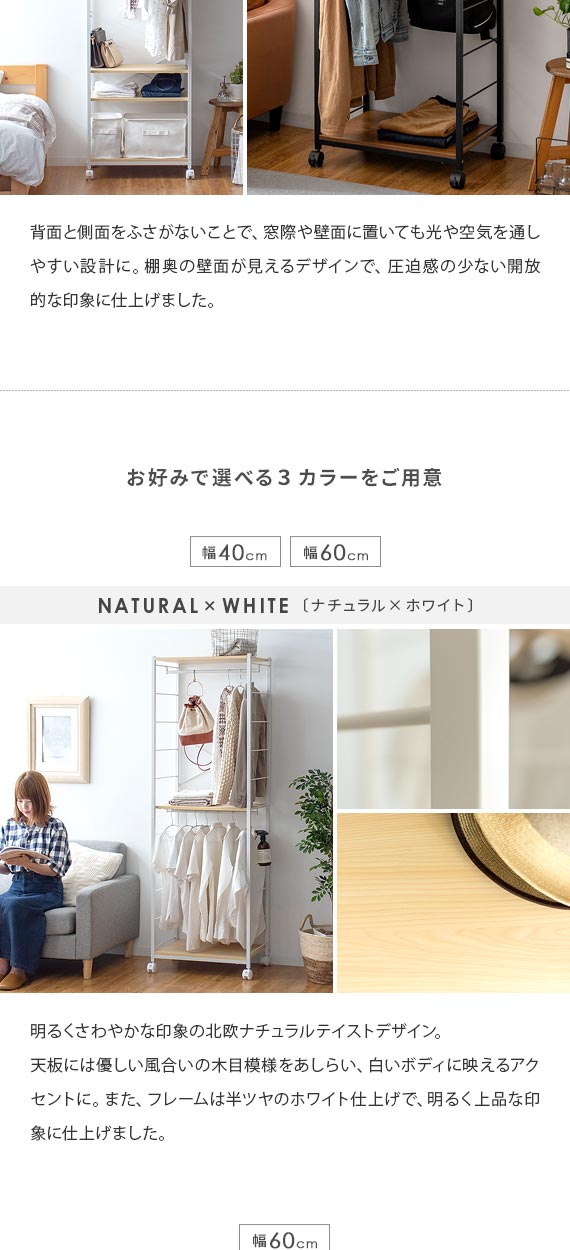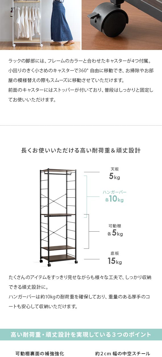 | 備考 | 組立式(組立て時間約45分) ※若干の個体差により、表記サイズと多少の差異が生じる場合がございます。 キャスター付き可動、バー2本、可動棚2枚付き |