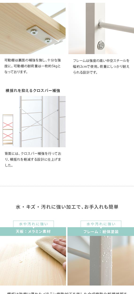 | 耐荷重 | 可動バー/各約10kg、可動棚/各約5kg 天板/各約5kg、底板/約15kg |