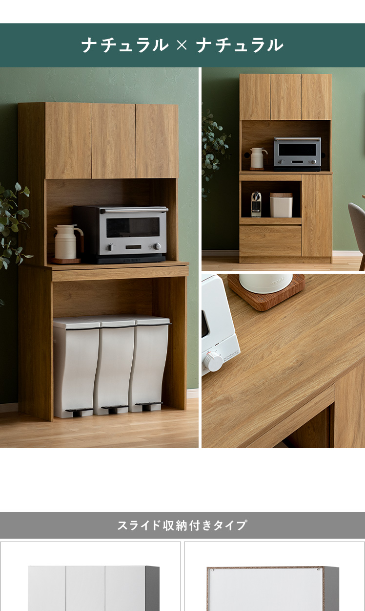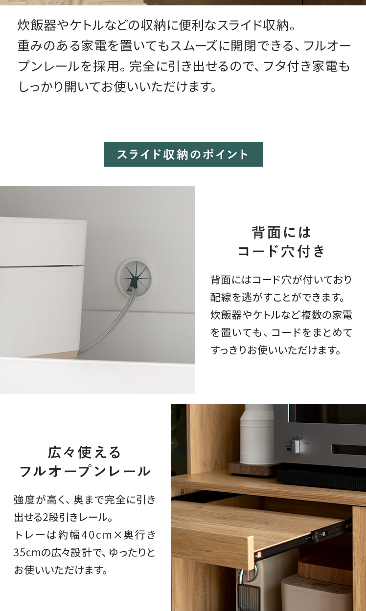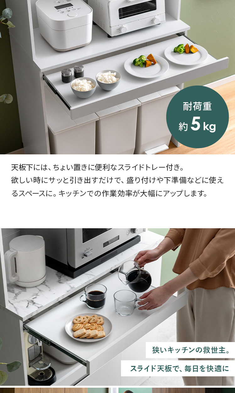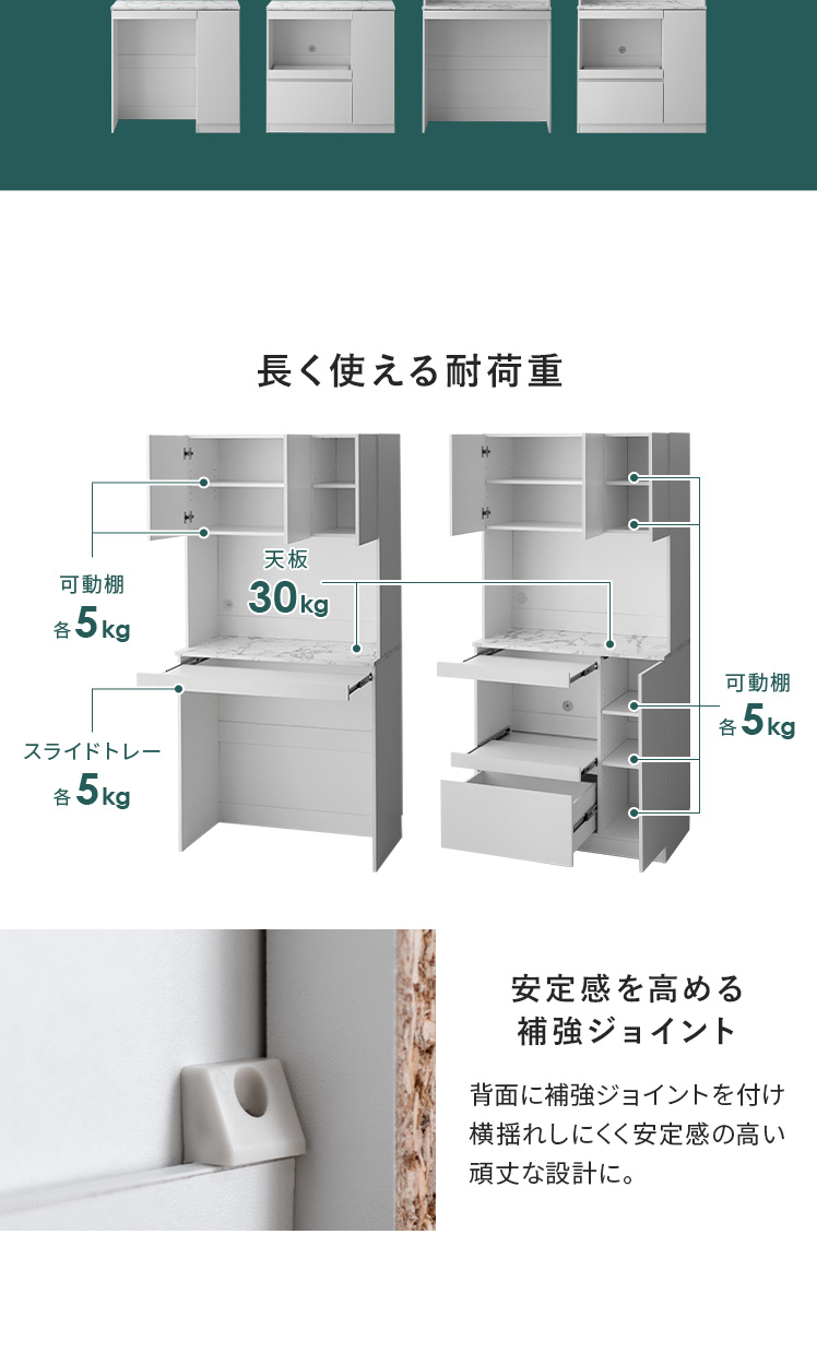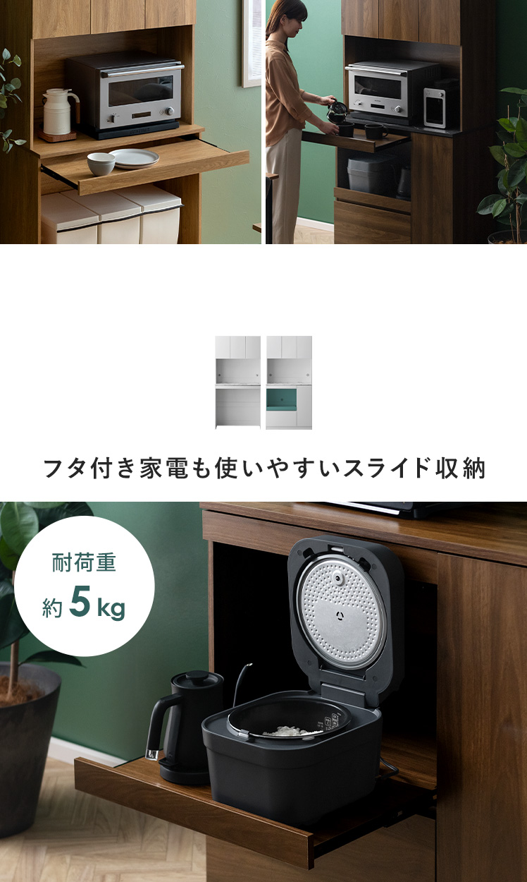 | 耐荷重 | 天板/約30kg、スライド棚/約5kg、引出し//約5kg、可動棚/約5kg |