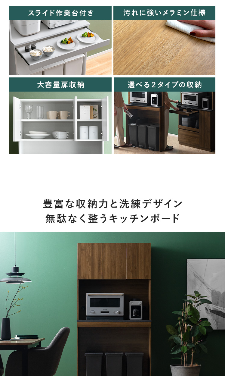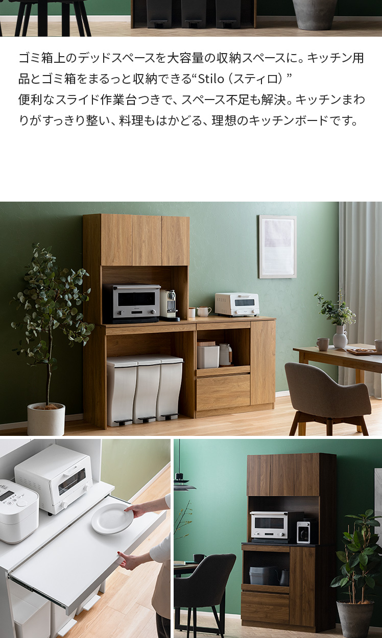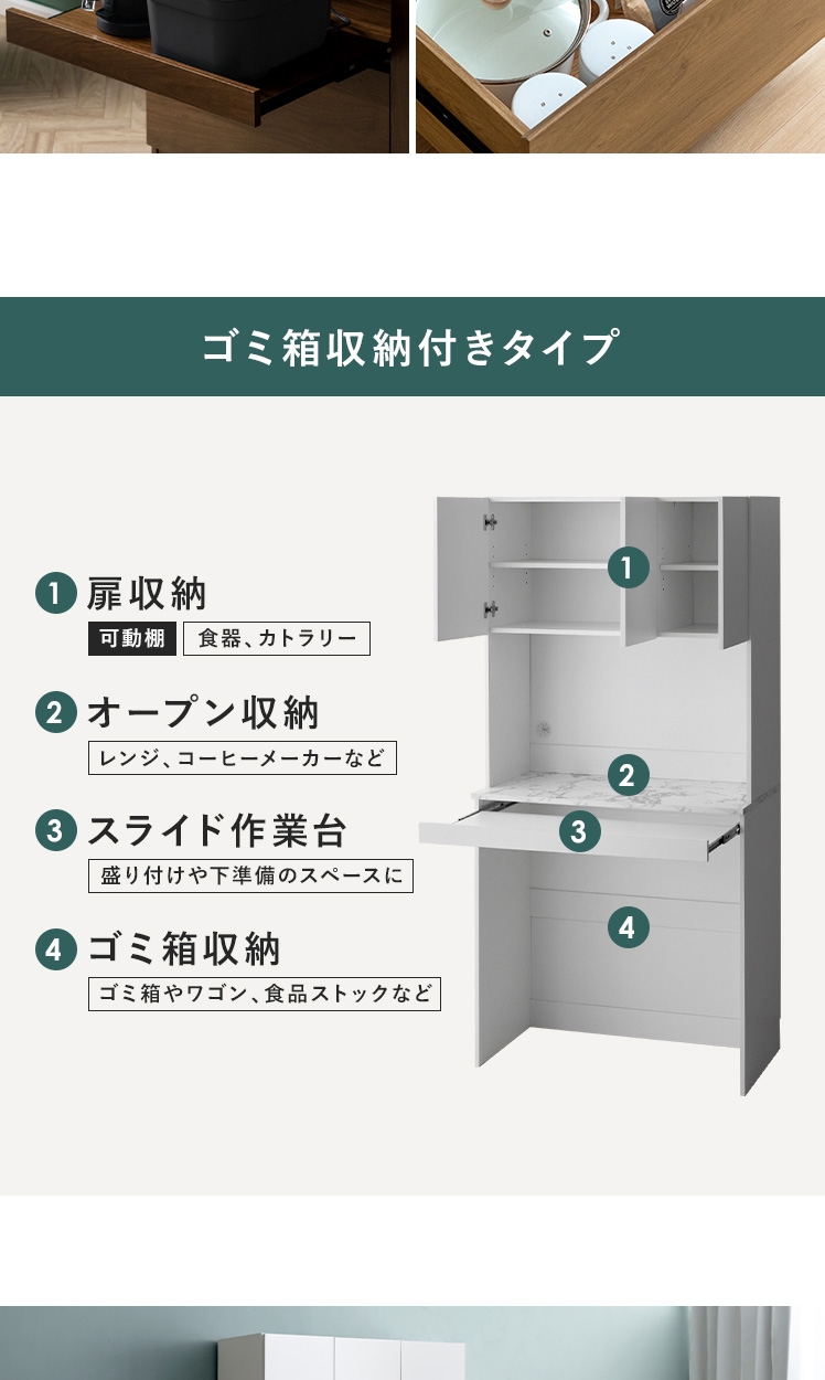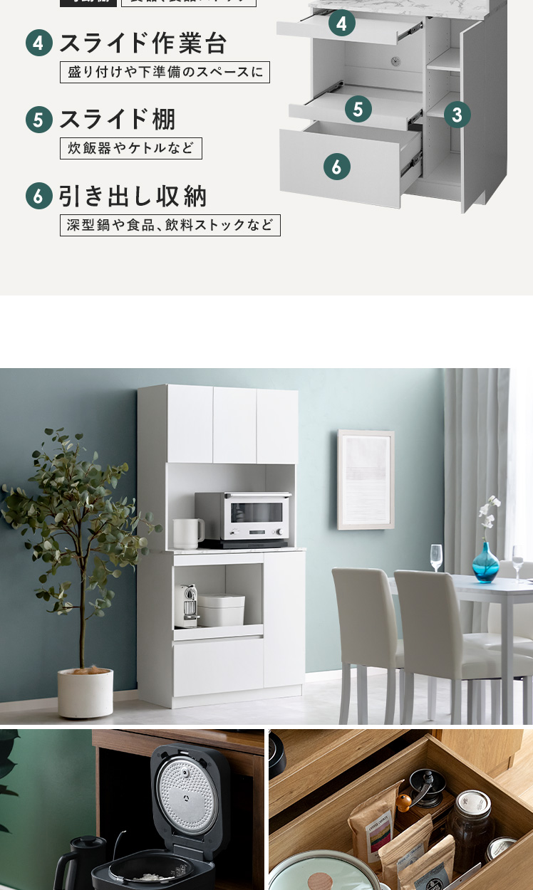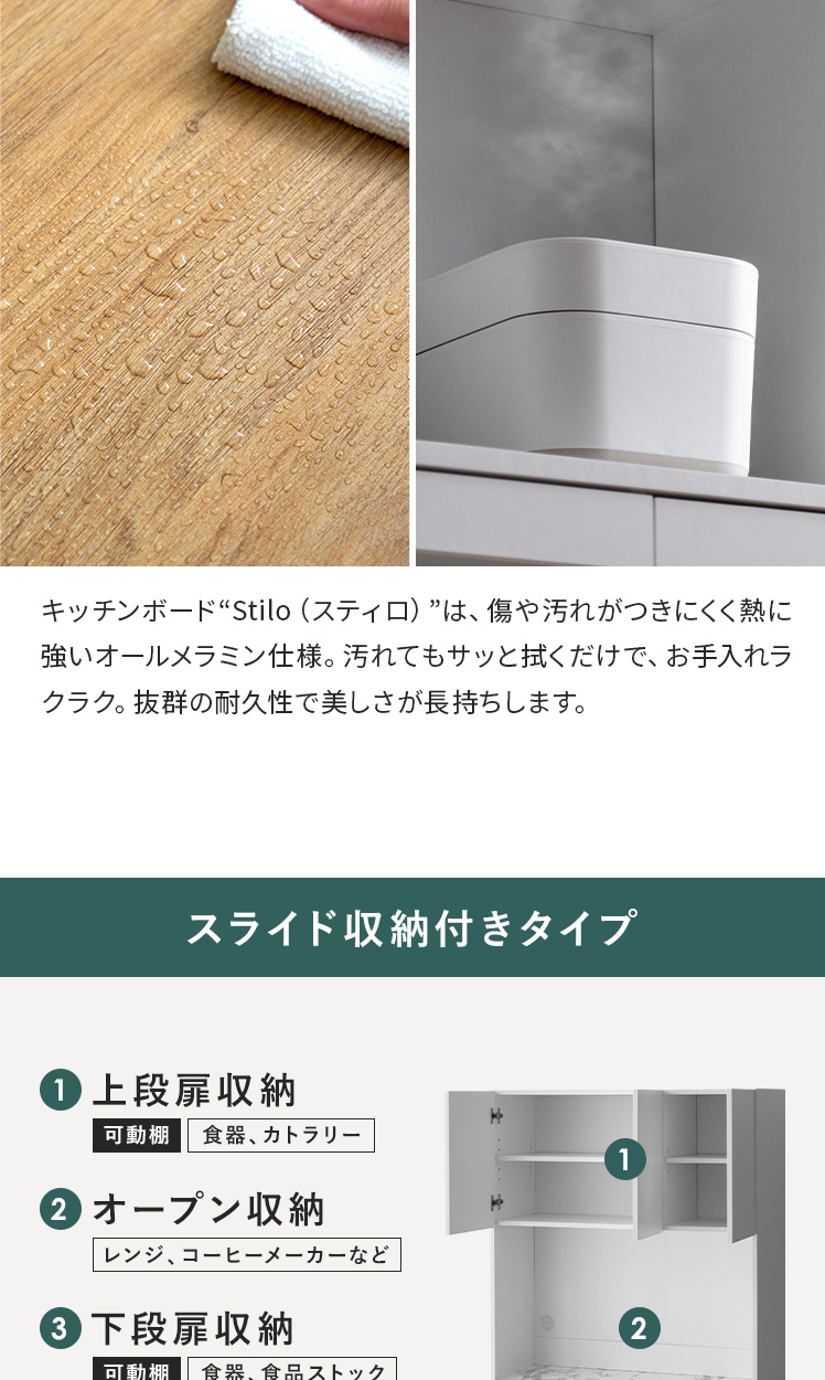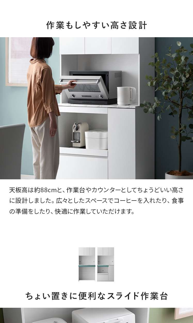 | 耐荷重 | 天板/約30kg、スライド棚/約5kg、引出し//約5kg、可動棚/約5kg |