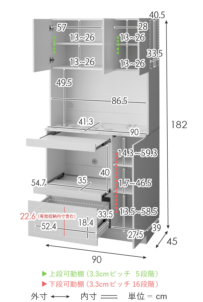 | 左上扉収納内寸 | 約幅57×奥行き33.5×高さ40.5cm |