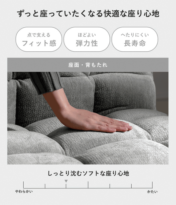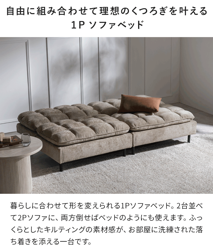| 備考 | 組立式(組立て時間約15分) ※若干の個体差により、表記サイズと多少の差異が生じる場合がございます。 ※二人以上の組み立てを推奨しております。 ※ソファーベッドは商品構造上、背もたれを倒してベッドとして使用する際、背もたれ側の端に体重をかけると不安定になる場合がございます。 ご使用の際は、壁面設置を推奨しております。 |