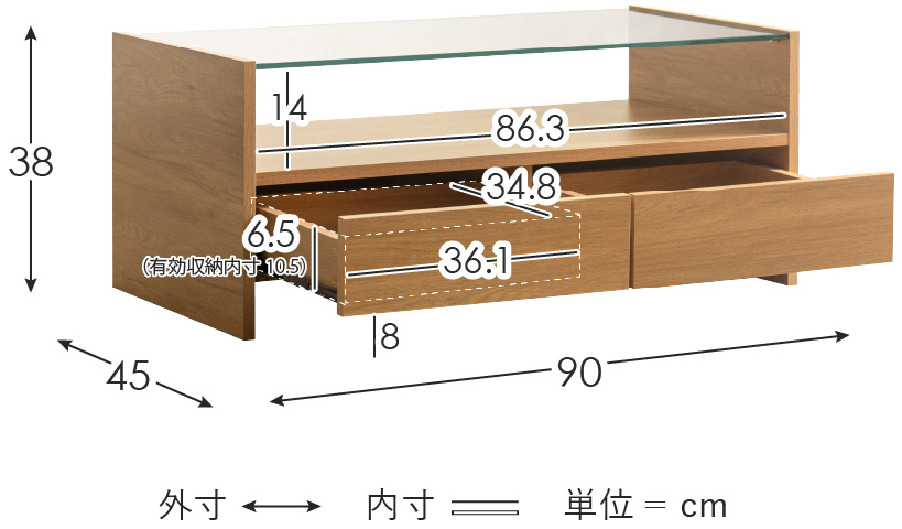 【耐荷重】ガラス天板/10kg、棚板/2kg、引出し/各2kg