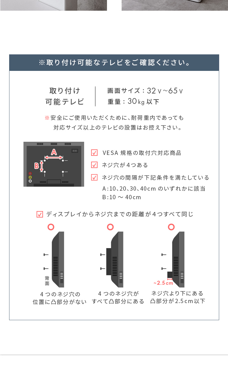 | 対応テレビサイズ | 32?65型(VESA規格の取付穴対応商品) |